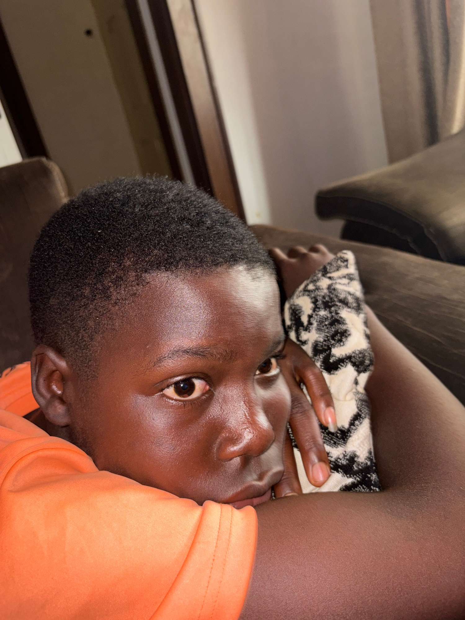 A close-up, tilted image shows a dark-skinned person with short, black hair lying down, possibly on a couch. The person's right eye is open and facing the camera. Their head is resting on a black andβ¦read more