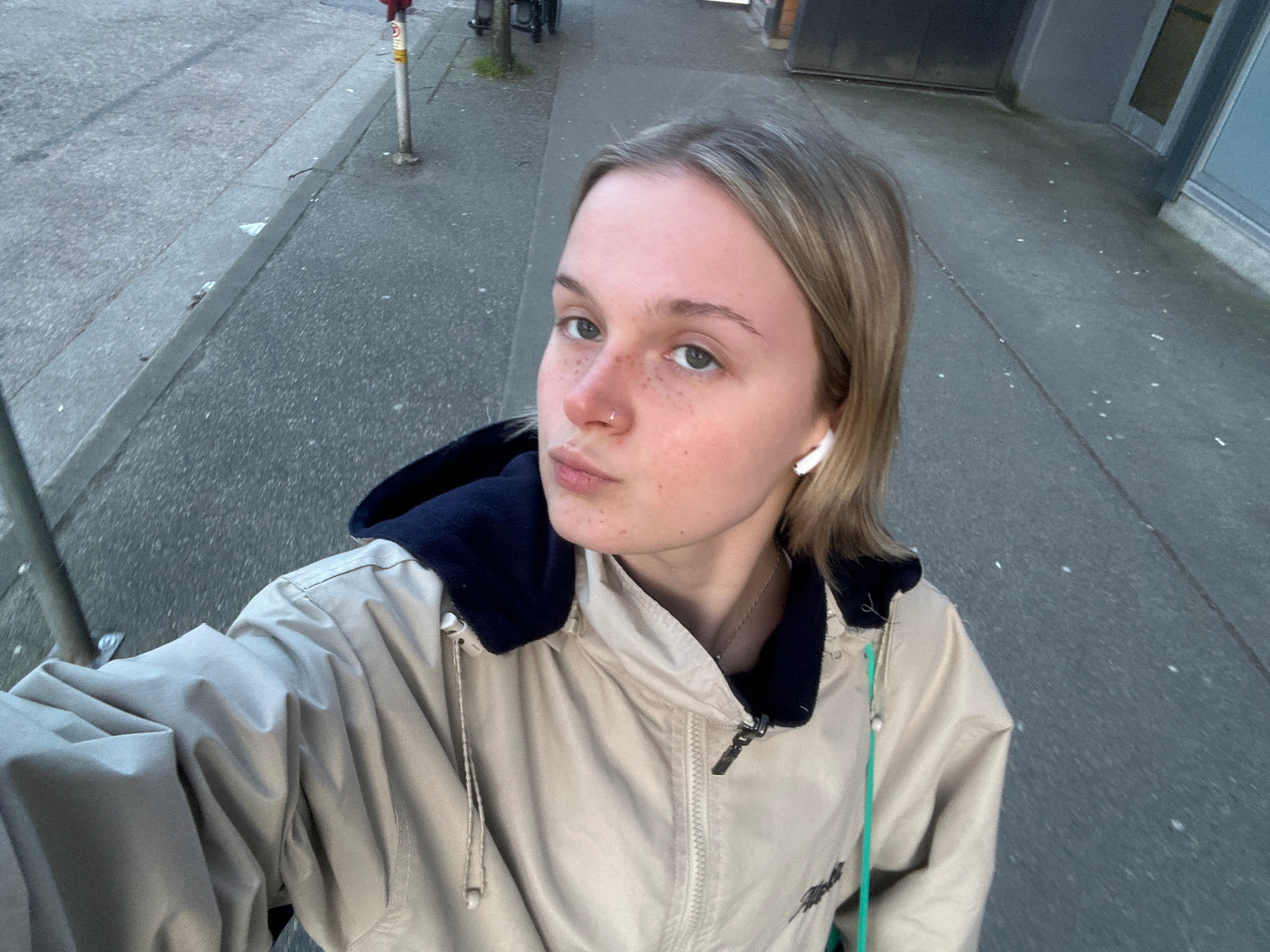 A young person with blonde hair and fair skin is wearing a beige jacket with a dark blue collar and what appears to be an earbud in their left ear. They have freckles and a small piercing in their nos…read more