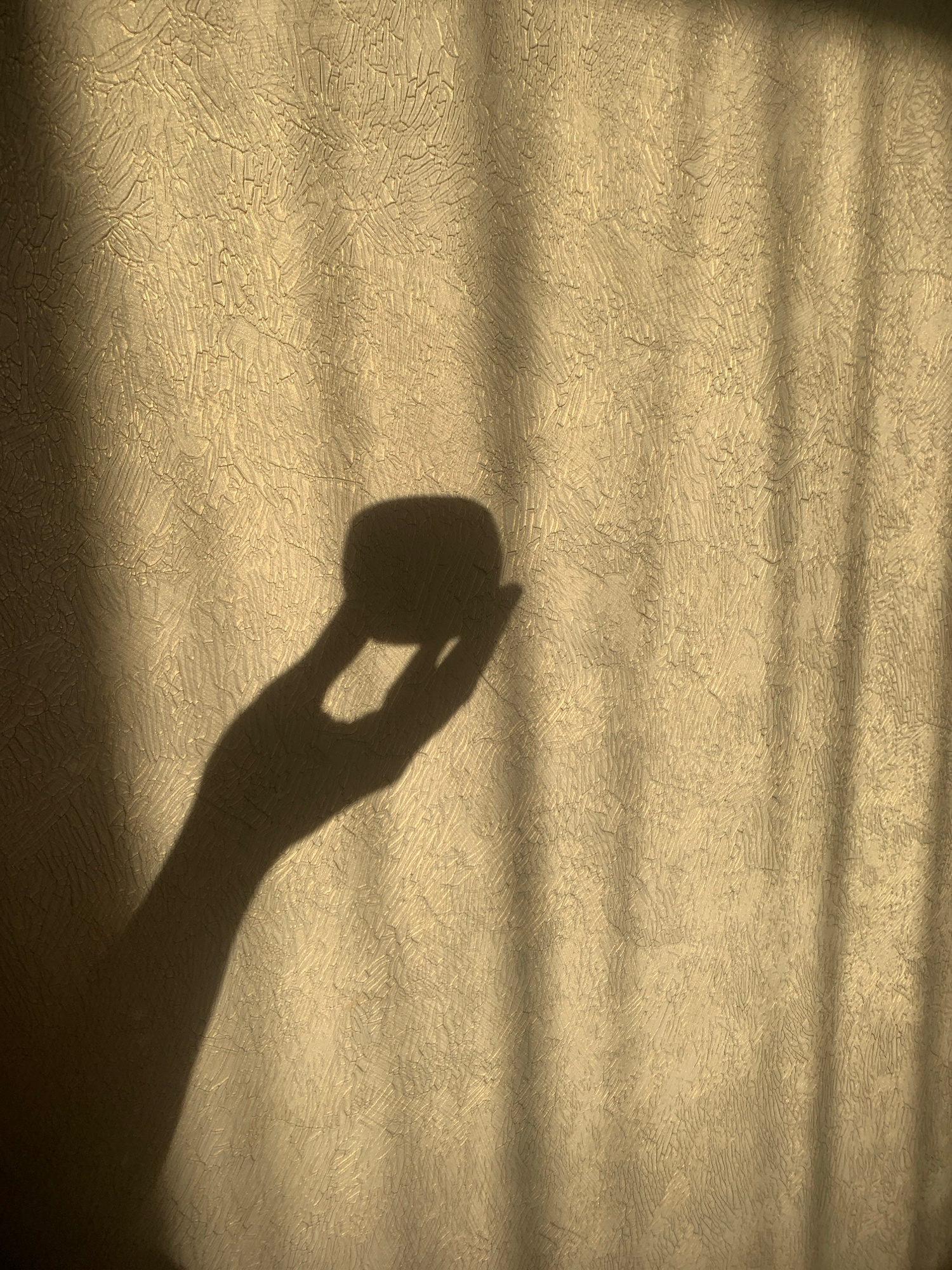 The image shows the shadow of a hand holding an object, projected onto a textured wall. The wall appears to be covered in a light-colored, possibly beige or cream-colored, material with a crackle or t…read more