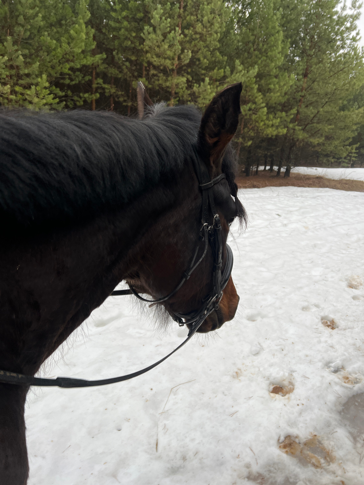 The image depicts the head and neck of a dark brown horse wearing a bridle. The horse is positioned outdoors in a snowy environment. In the background, trees are visible on the left side, and a snow-c…read more