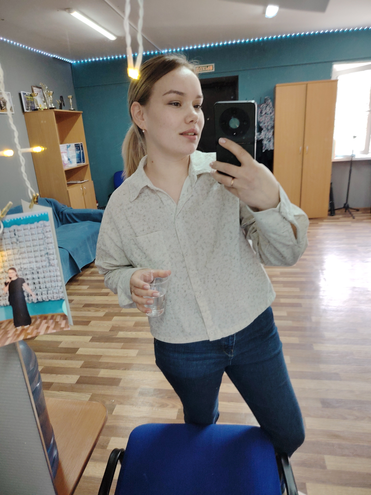 A young woman is captured in a mirror selfie inside what appears to be a studio, classroom, or office in Chaikovsky, Russia. She has light-colored hair tied in a ponytail and is wearing a light, subtl…read more