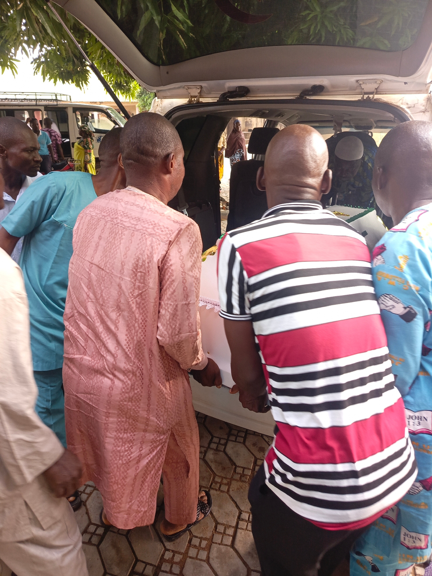 In a daytime scene in Akwanga, Nigeria, multiple men are engaged in the process of loading a white, rectangular object, likely a casket, into the open rear hatch of a light-colored vehicle, possibly a…read more