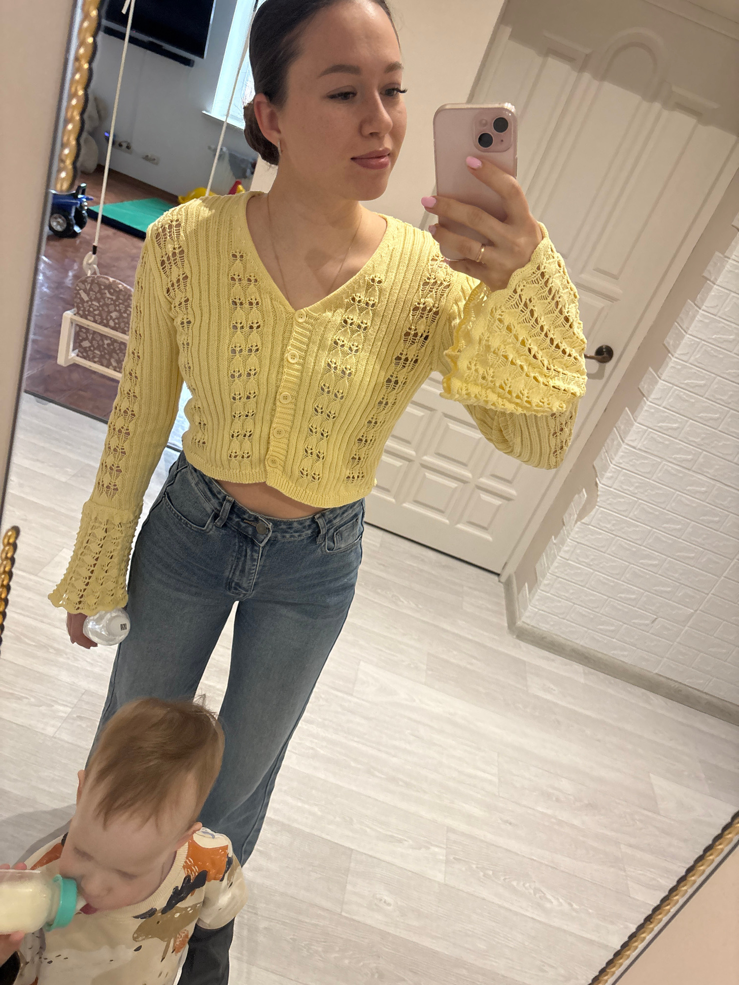 An adult woman is depicted taking a mirror selfie indoors, holding a light pink smartphone with a clear case in her right hand. Her nails are painted pink, and she wears a delicate ring on her right r…read more