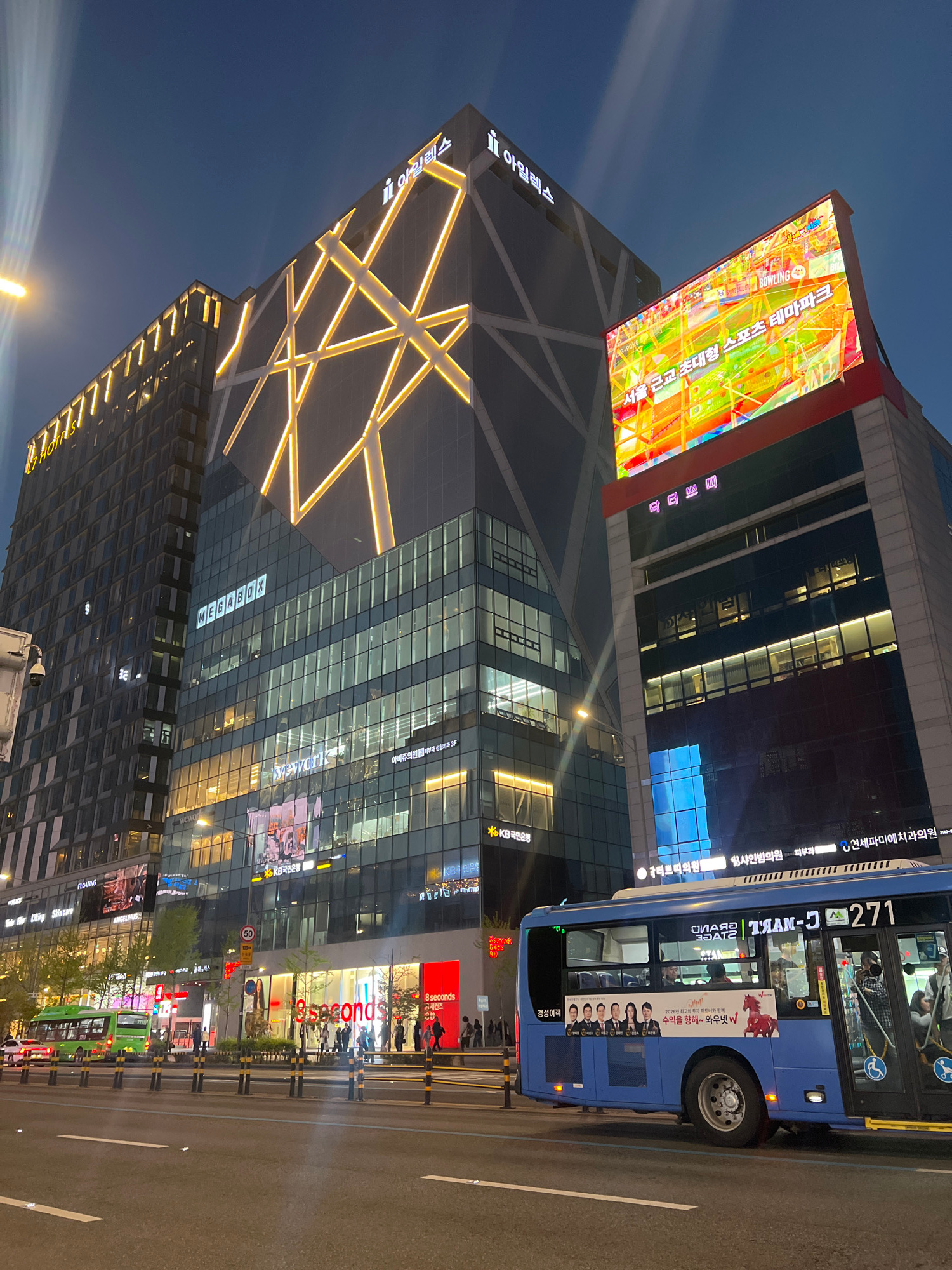 This is a night scene in Seoul, South Korea. A tall, modern building dominates the view. Its exterior features a triangular geometric design with illuminated golden lines. Atop the building is a large…read more