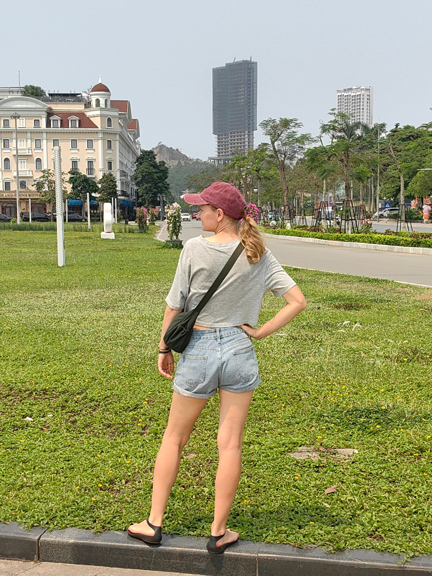 A woman stands on a curb, facing away from the viewer, in a city park in Bai Chay Ward, Vietnam. She wears a maroon baseball cap, gray cropped t-shirt, jean shorts, and black sandals, with a black bag slung over her shoulder. Her left hand rests on her hip. Behind her, a large green lawn dotted with small yellow flowers stretches towards a sidewalk and a road. Across the road is a row of trees and shrubs. In the background, several buildings are visible, including a large, ornate hotel on the left, and two tall, modern skyscrapers further back. A small mountain is visible behind the buildings. | Open Wire