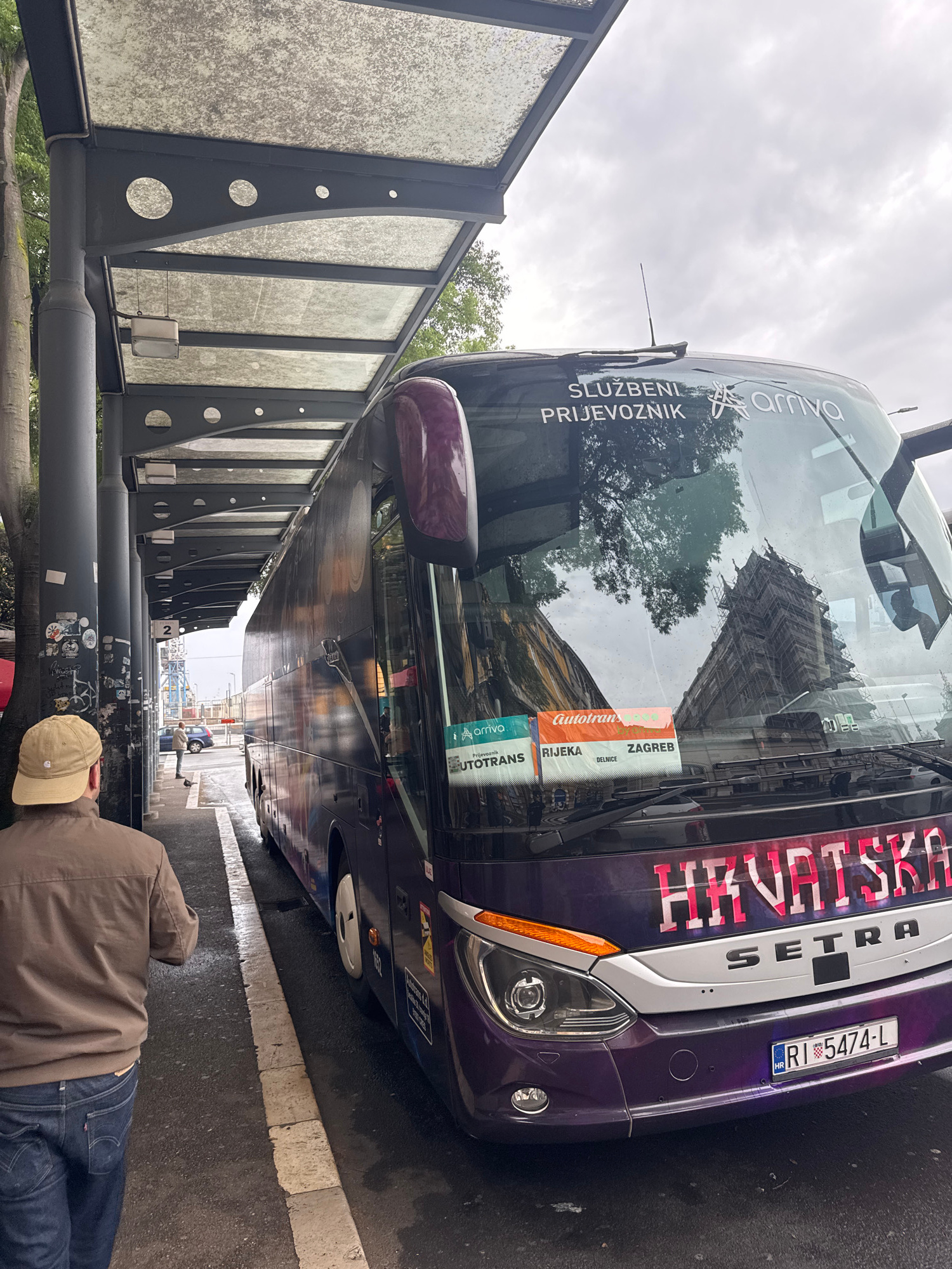 The image shows a bus station in Rijeka, Croatia. A person wearing a tan jacket and khaki baseball cap is lying on the sidewalk in front of a bus. The bus is purple and white, with "HRVATSKA" written…read more