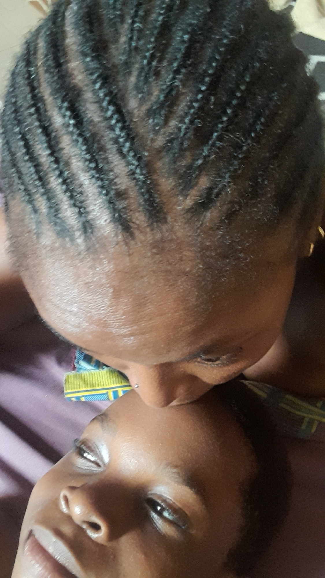 The image features two individuals, likely women, in close proximity. One has tightly woven braids and is wearing a patterned earring. The other woman is positioned to the right with her eyes partiall…read more