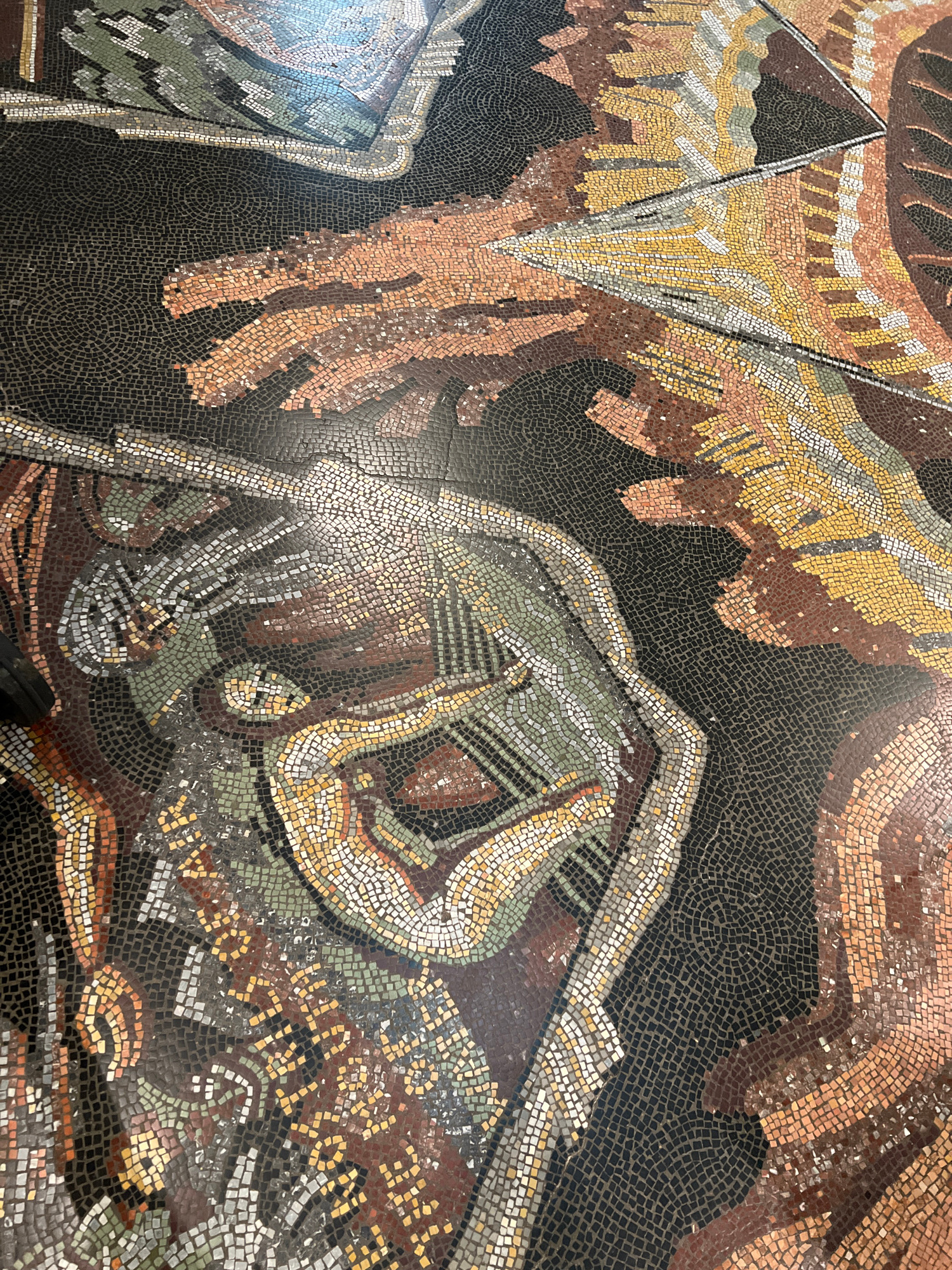 The media file showcases a detailed section of a large mosaic artwork, composed of numerous small, irregularly shaped tesserae. The predominant color palette consists of earthy tones including variousβ¦read more