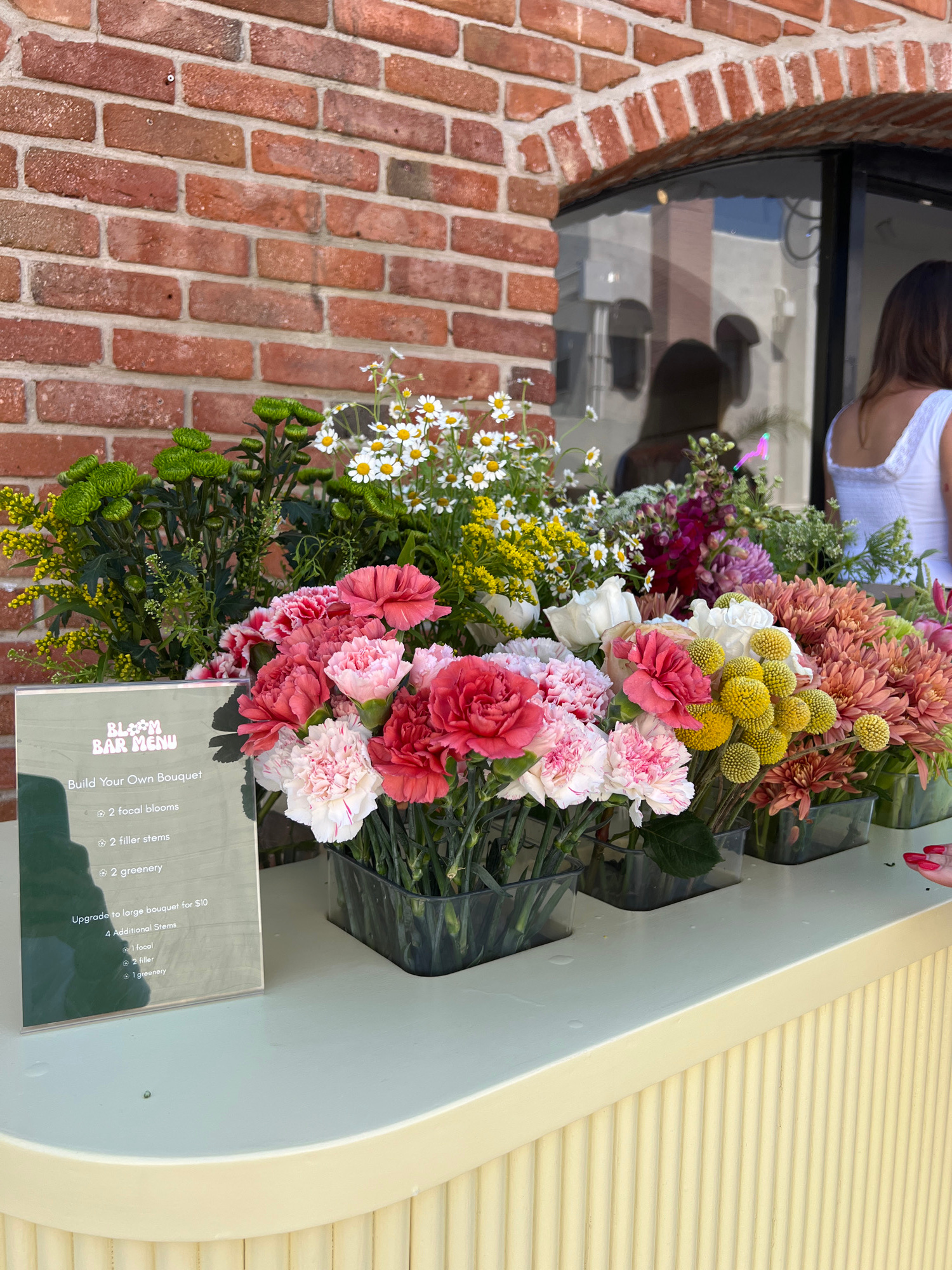 Here is a matter-of-fact description of the image: The image shows a flower bar menu set up outside a shop with a brick facade. The menu, titled "Bloom Bar Menu," details options for building a custo…read more