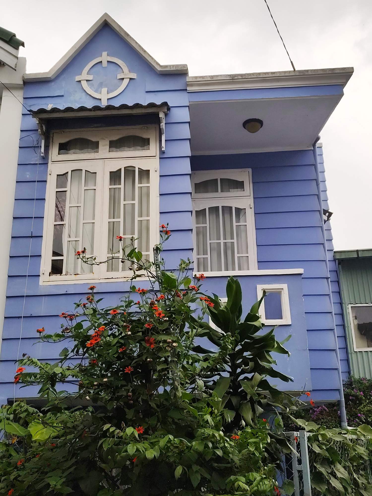 A two-story blue house with white trim is partially obscured by overgrown bushes with orange flowers. The house has horizontal siding and a gabled roof with a circular decoration. The lower window is…read more