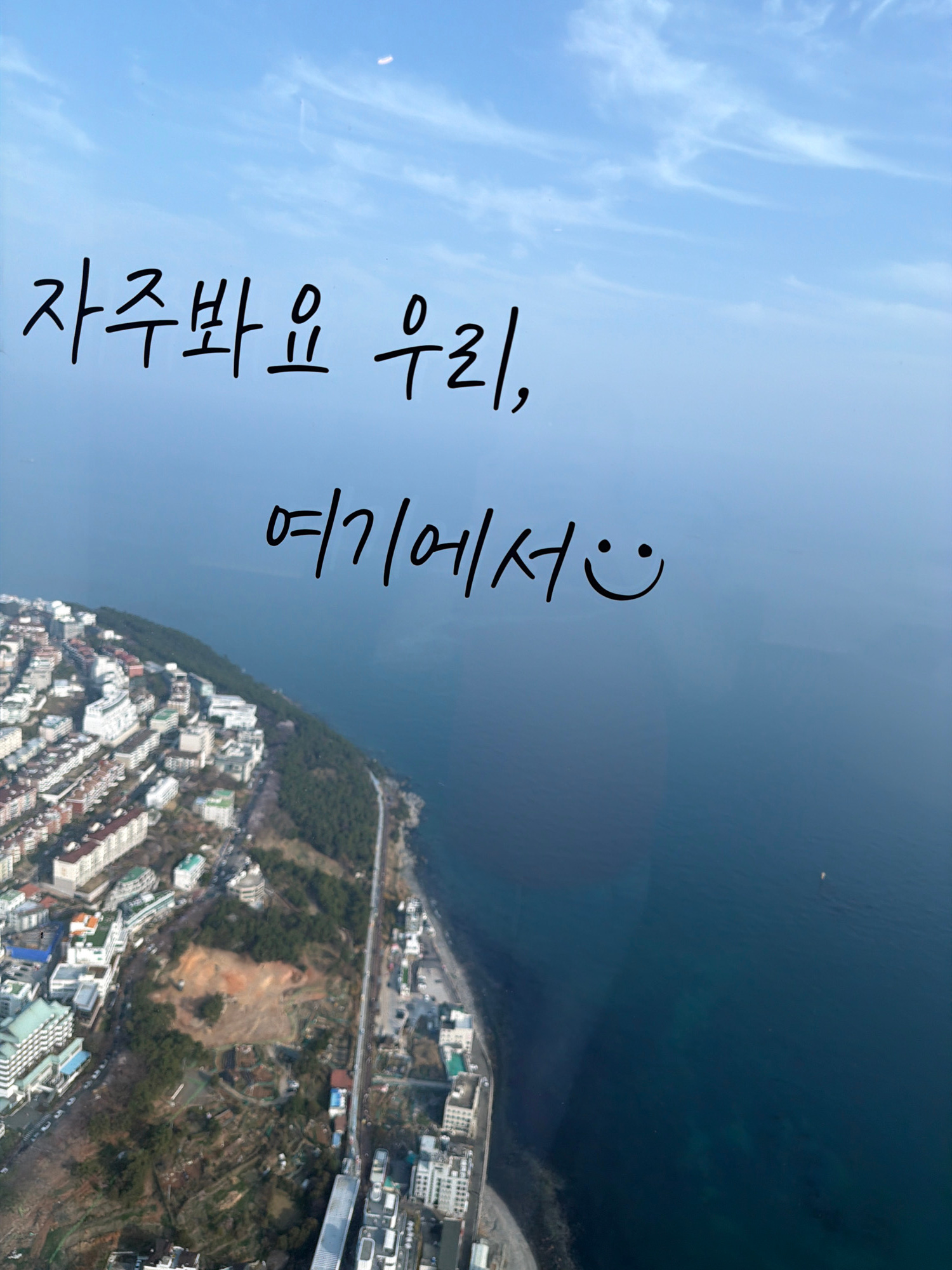 The image depicts a scenic view of Busan, South Korea. A body of water, likely the sea, occupies the top right. Below the sea is a coastal area with visible buildings, roads, and vegetation. The image…read more