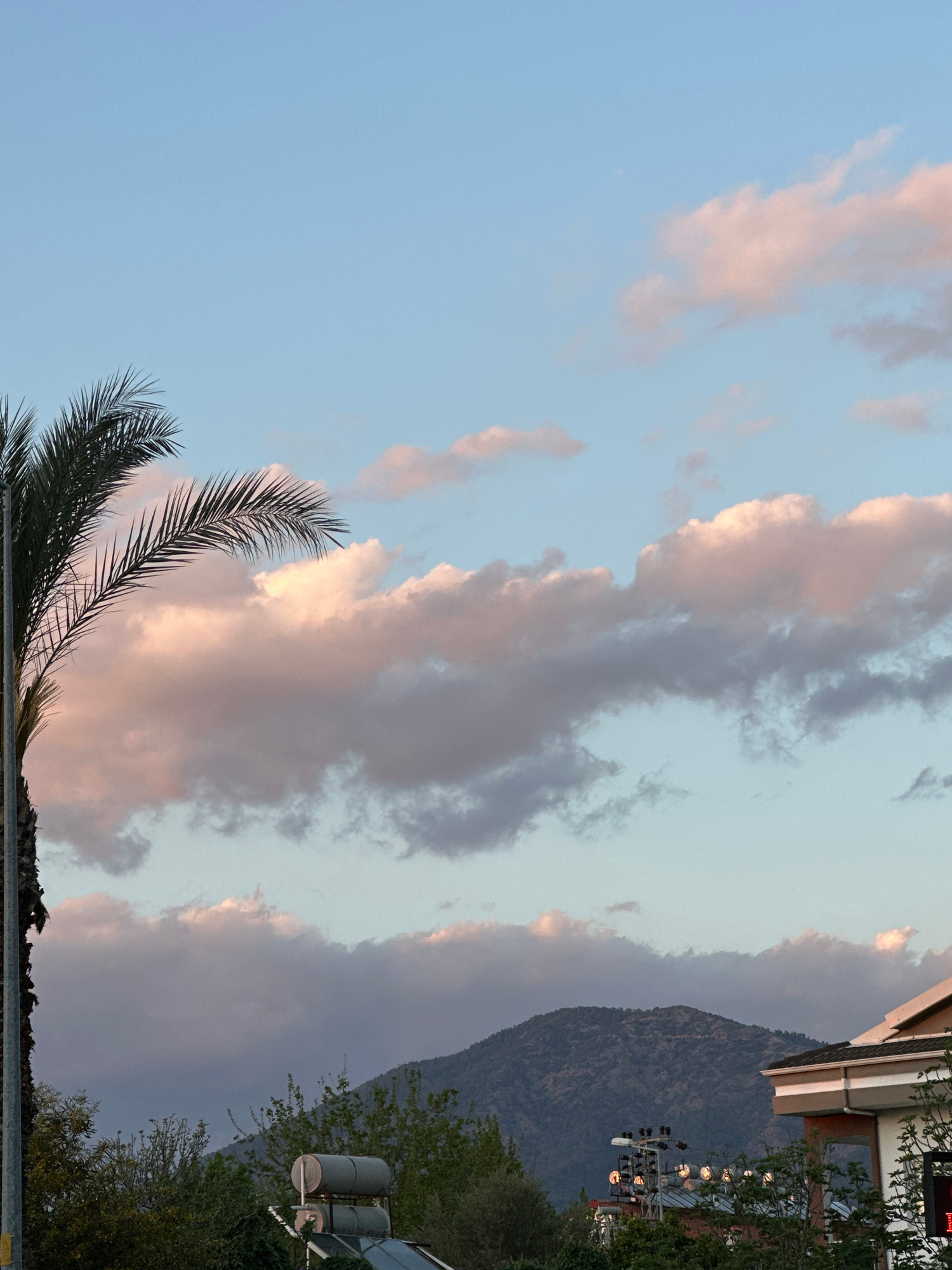 The image shows a sky with pink and gray clouds in Fethiye, Turkey. To the right, a dark, tree-covered mountain is visible. Palm tree fronds extend from the bottom left corner towards the clouds. A bu…read more