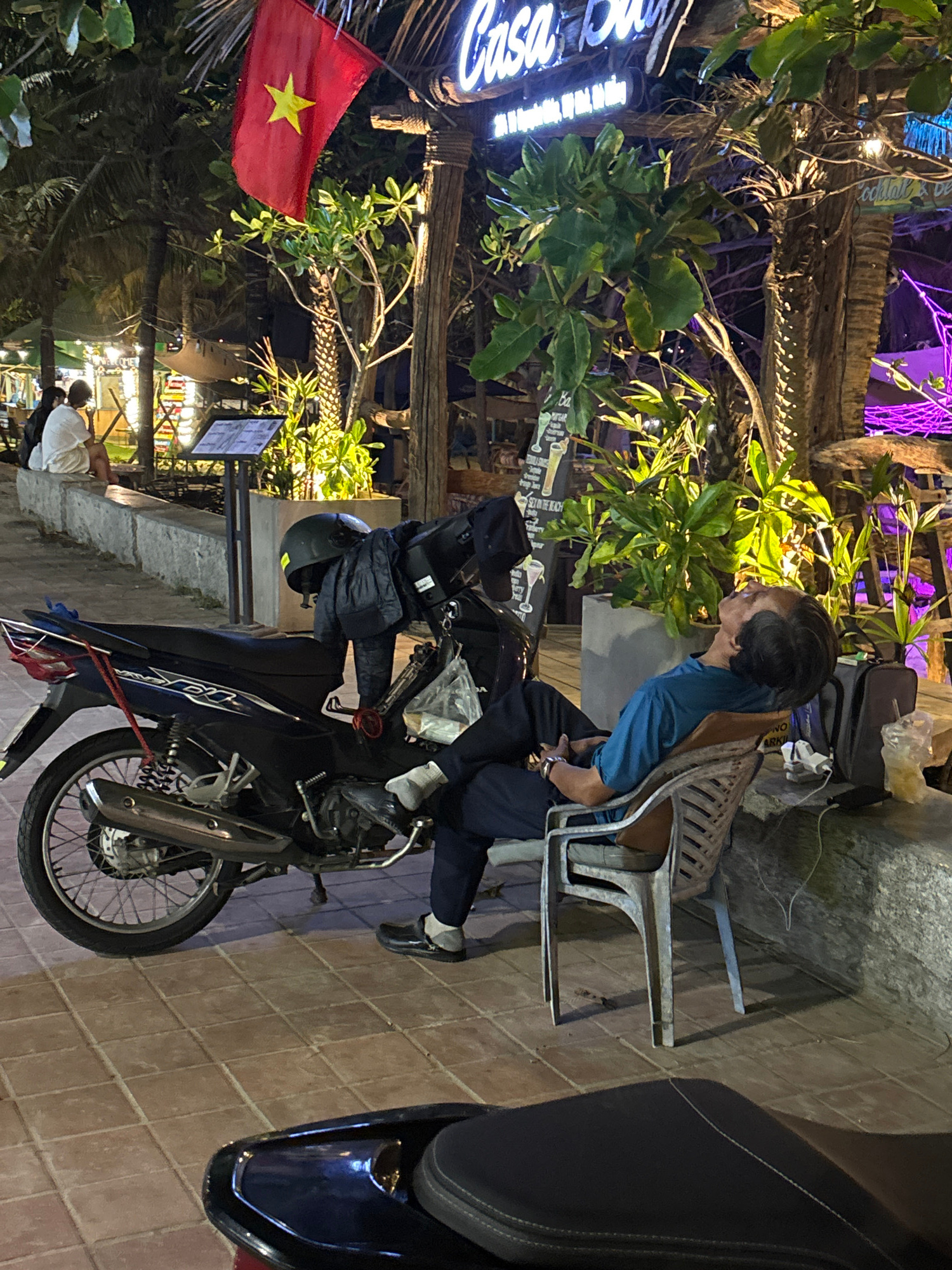 Captured at night in Đà Nẵng, Vietnam, the scene depicts a man sitting on a chair, leaning towards a parked motorbike. The Vietnamese flag is visible on the left, next to a building with a sign saying…read more