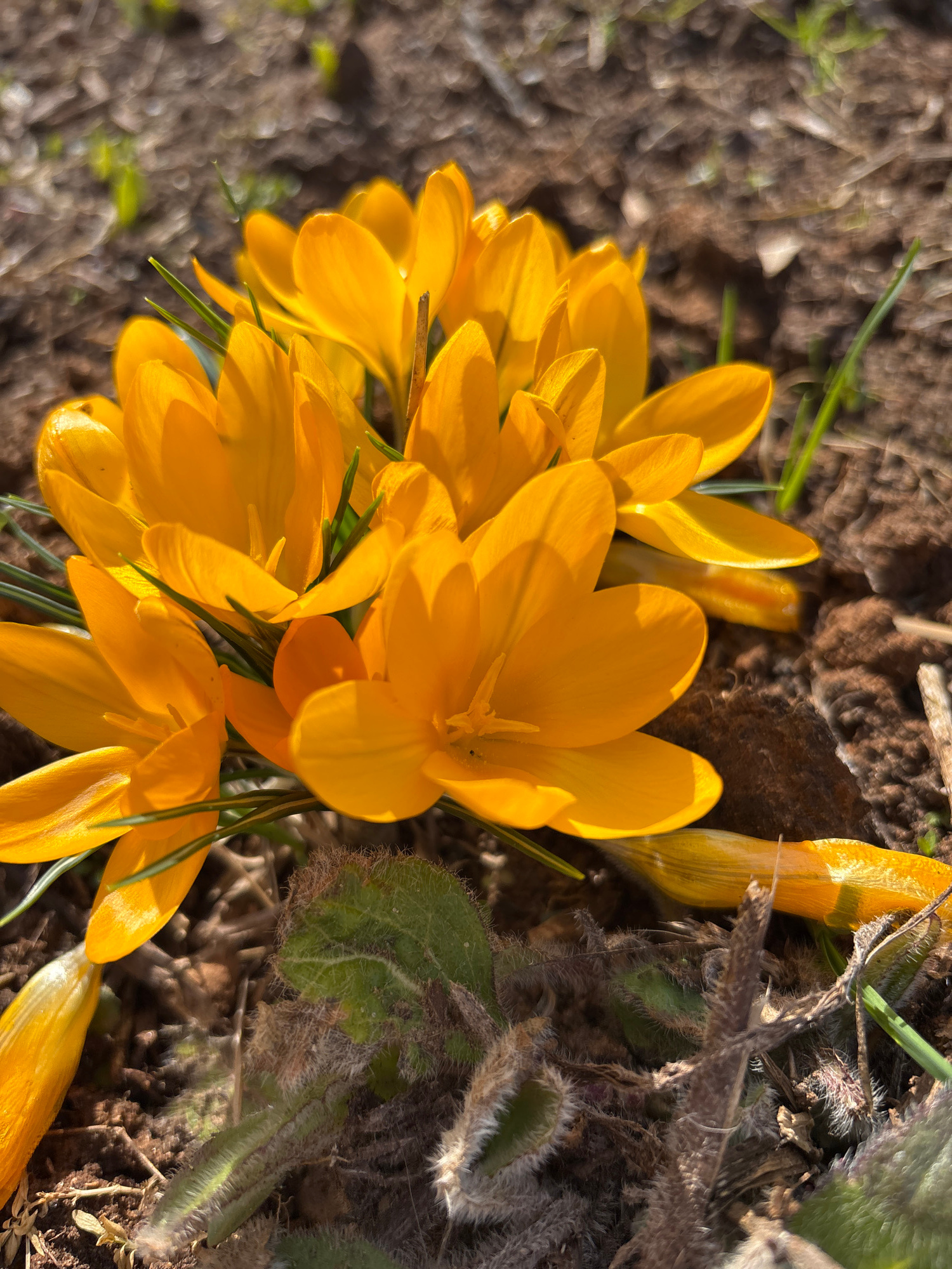 The image depicts a cluster of yellow crocuses blooming in soil. The flowers are the dominant feature, with several fully open and others still closed. Thin green blades of grass are interspersed amon…read more