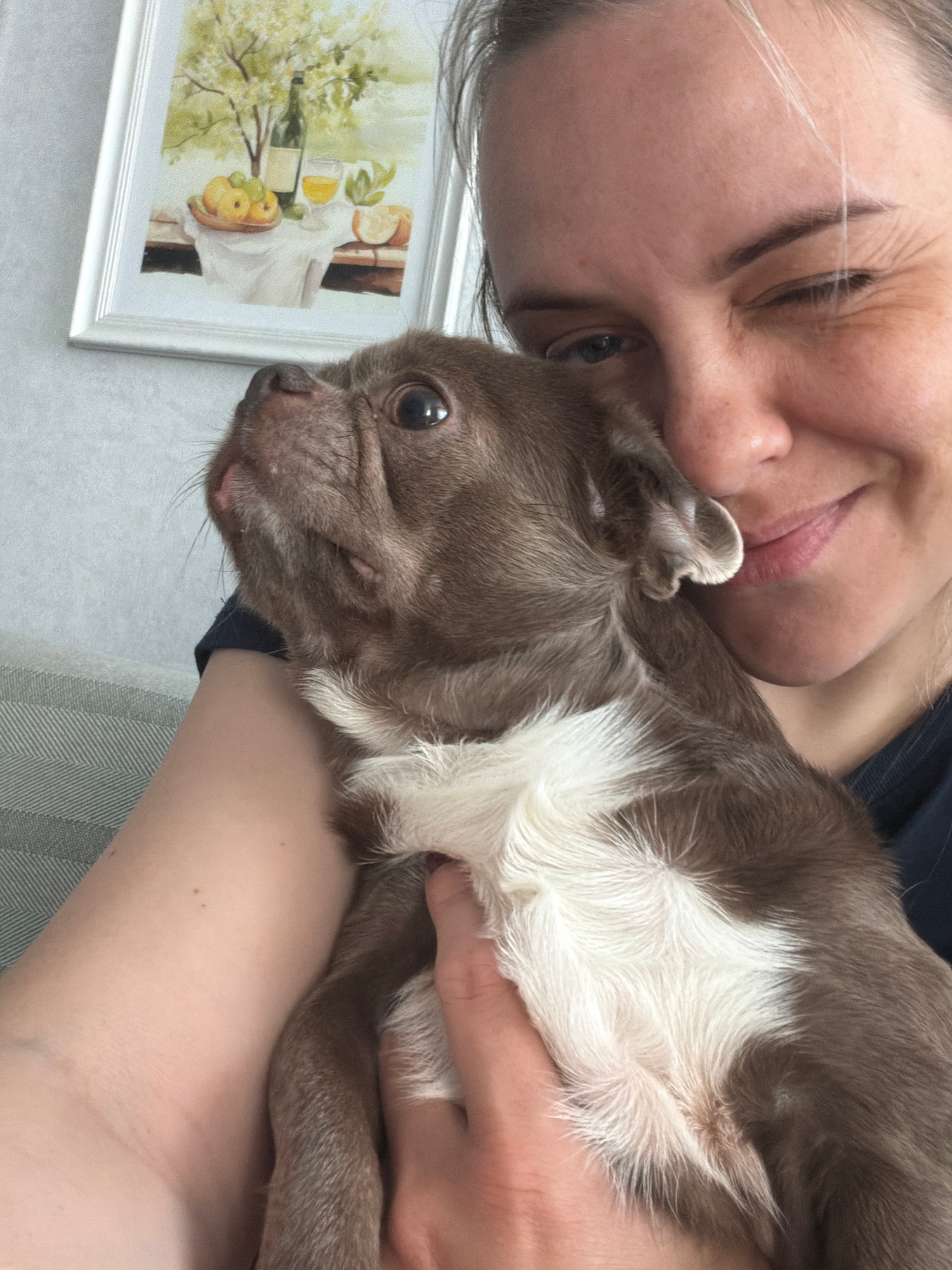 A woman is holding a small brown and white dog. The woman is fair-skinned with blonde hair and is smiling with one eye closed. The dog is brown with a white chest and muzzle. The background includes a…read more