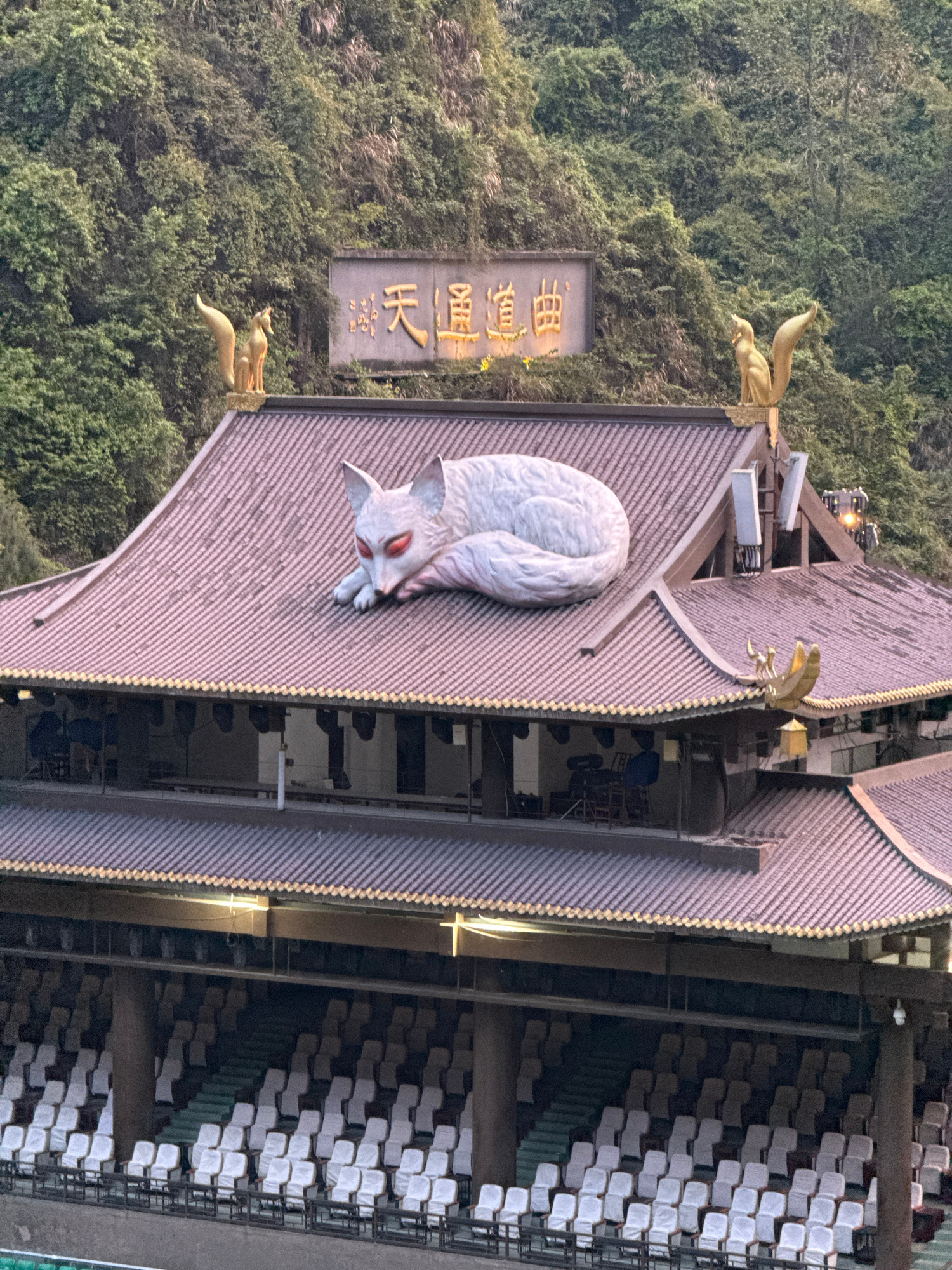 A low-angle, slightly blurry photograph depicts a building with traditional Chinese architectural elements in Zhangjiajie, China. The building has tiered roofing with pinkish-grey tiles. Atop the high…read more