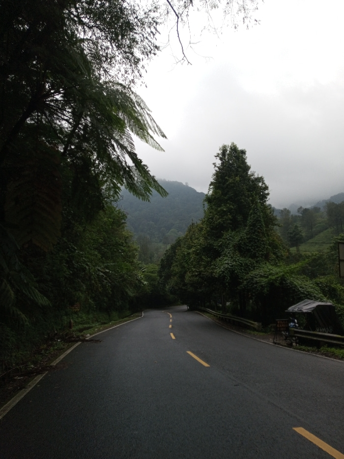 This image depicts a two-lane asphalt road, appearing damp, curving to the left through a mountainous, heavily vegetated environment identified as Ariyalai, Sri Lanka. The road is marked with dashed y…read more