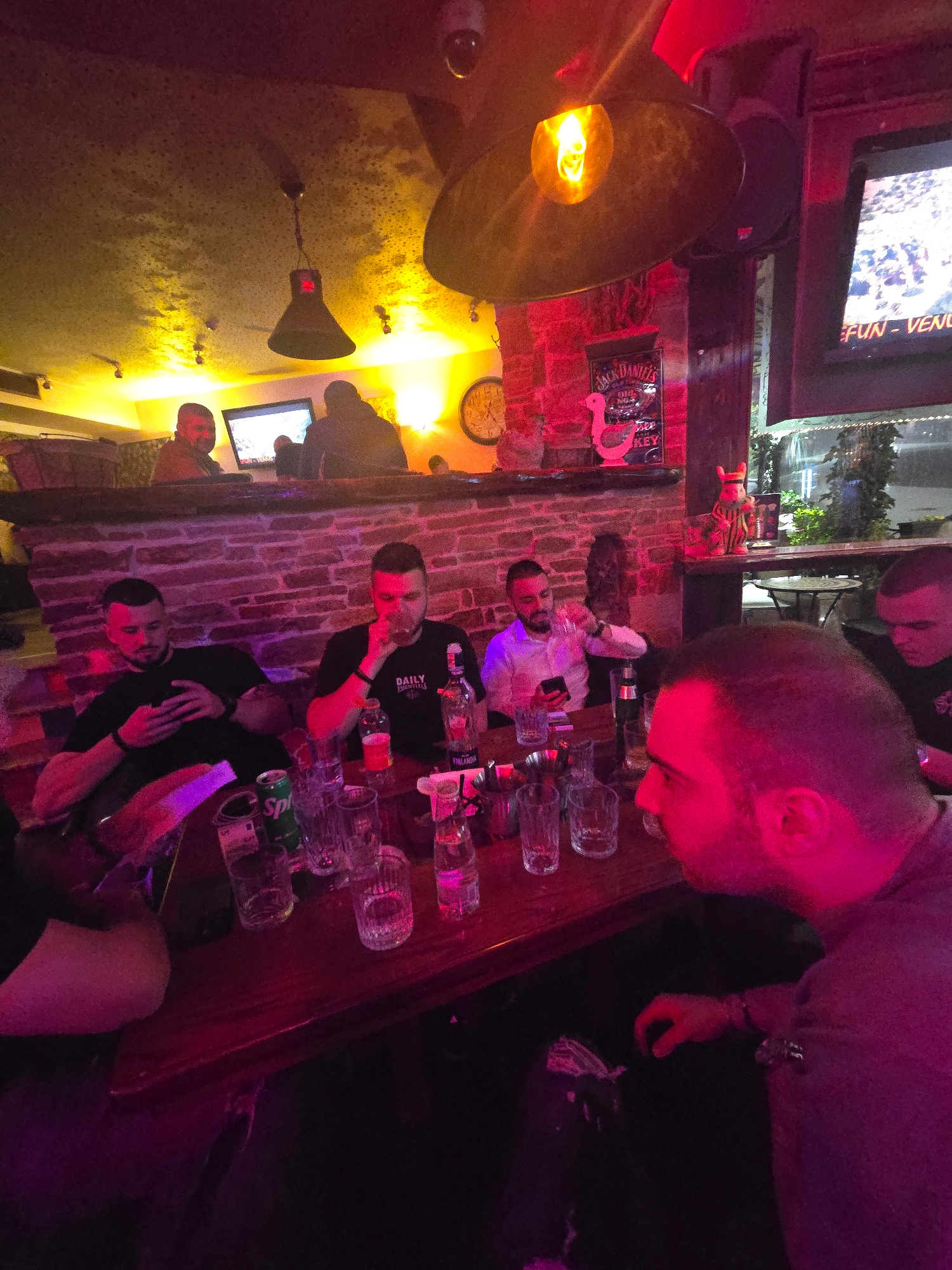 The image depicts the interior of a bar in Smolyan, Bulgaria, as indicated by a "Daily Freshness" water bottle and several men standing at a bar. There are multiple shot glasses on the bar. A TV shows…read more