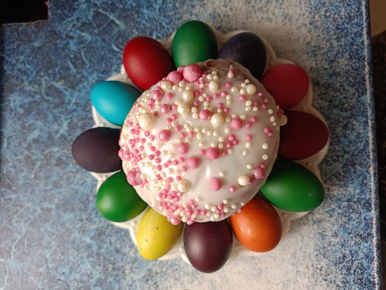 A close-up shot depicts an Easter cake adorned with white icing and pink and white sprinkles, surrounded by colorful Easter eggs (red, green, purple, blue, yellow, orange, brown). The cake and eggs ar…read more