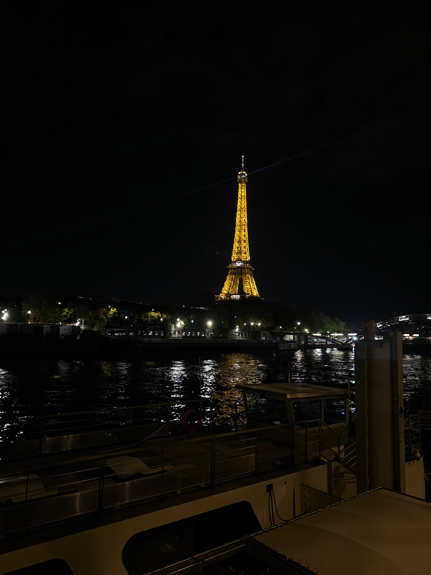 The image shows the Eiffel Tower at night, viewed from a boat on the Seine River. The tower is illuminated, and its lights are reflected in the dark water. The foreground shows part of the boat, inclu…read more