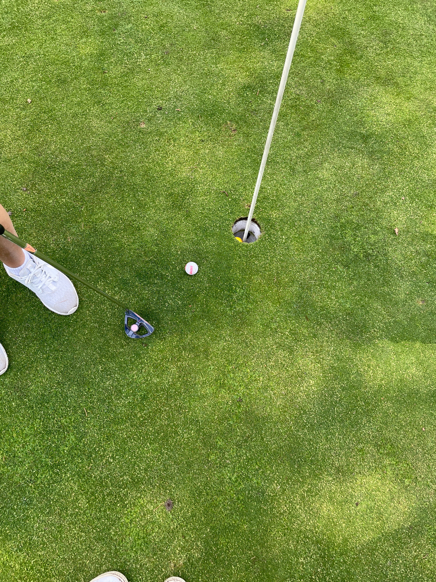 The image is an overhead shot of a golf green, likely on a golf course. A golf hole is visible in the upper left with a white pin flag extending out. A white golf ball sits a short distance from the h…read more