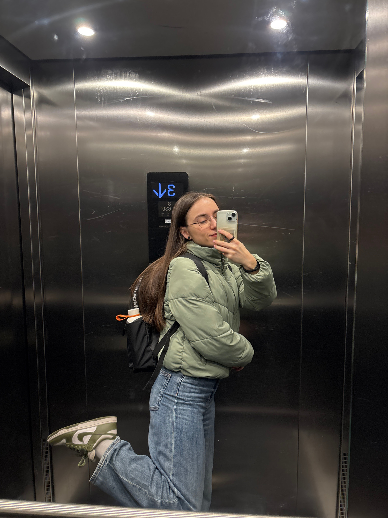 An image, rotated 90 degrees clockwise, captures a young woman taking a reflection selfie inside a modern elevator with metallic, highly reflective walls. The woman, positioned centrally, is looking d…read more