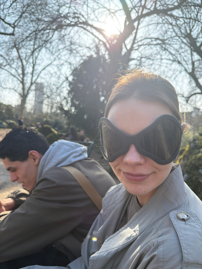 The scene depicts two individuals in Parco Sempione, Milan, Italy, under bright sunlight. In the foreground, an adult female with brown hair, wearing a light-colored trench coat, is positioned slightl…read more