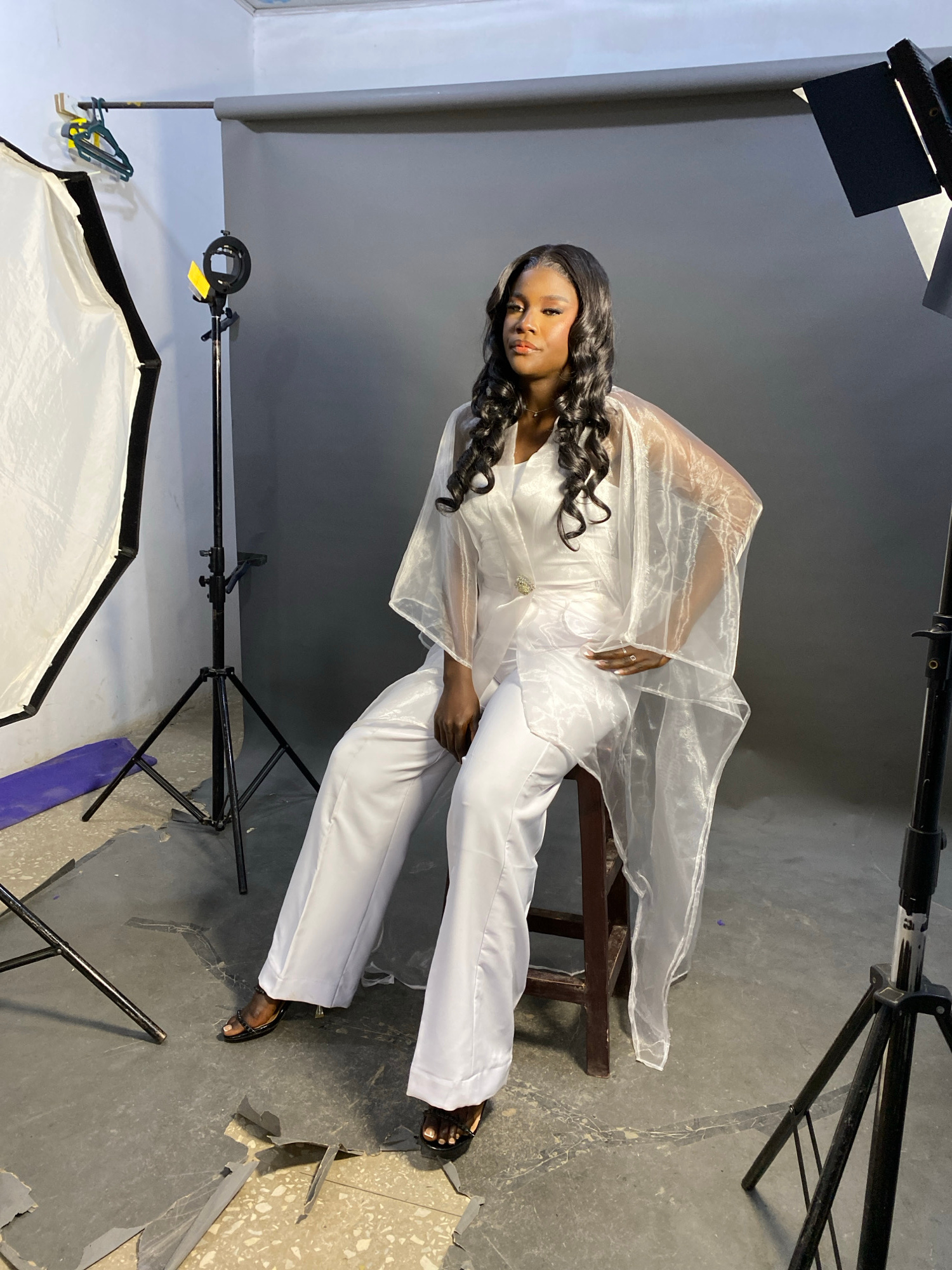 A woman poses for a photo in a studio setting in Jos, Nigeria. She is seated on a wooden chair, wearing a white suit with a sheer white overcoat and black sandals. The backdrop is gray, and various pi…read more