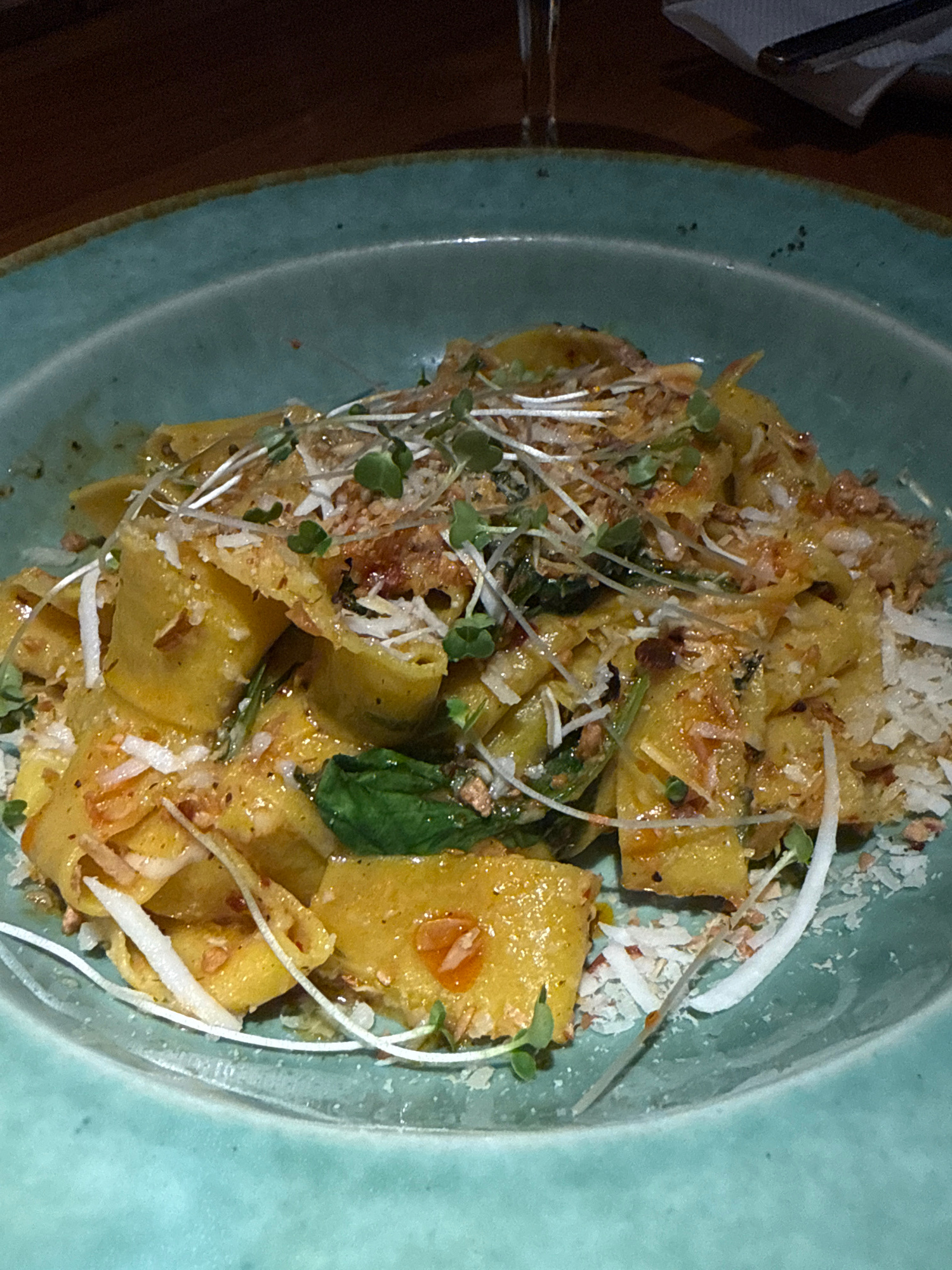 The image shows a plate of pasta on a light blue-green ceramic plate. The pasta is yellow and appears to be a larger, square cut, topped with shredded cheese or parmesan, fried garlic, and microgreens…read more