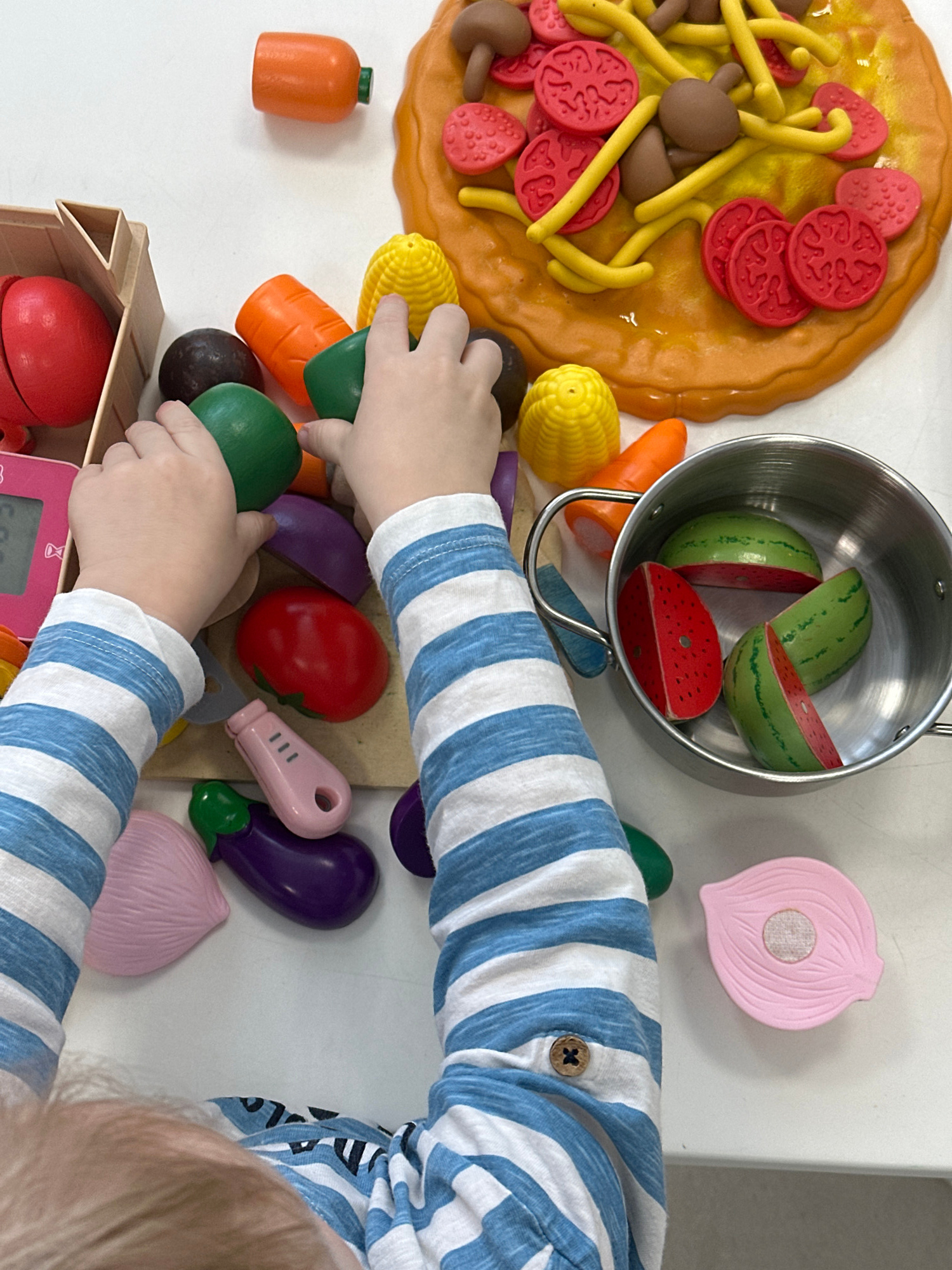 A child wearing a blue and white striped shirt is playing with toy food on a white surface. The child's hands are interacting with various toy fruits and vegetables, including corn, carrots, green avo…read more