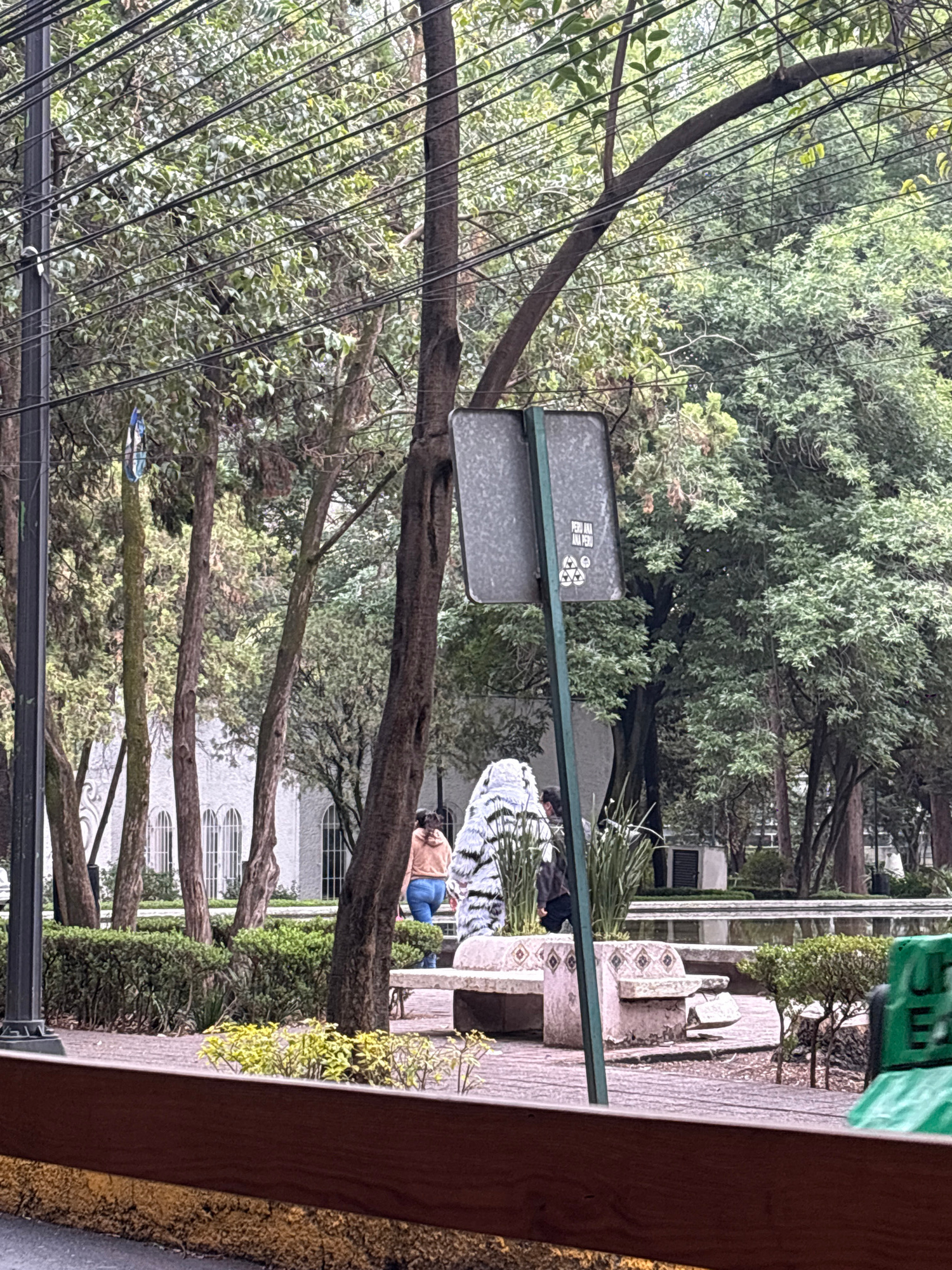 The image depicts a street scene in Mexico City, Mexico, with a park-like environment visible through trees and foliage. Power lines are visible in the foreground. A person is seated on a decorative c…read more