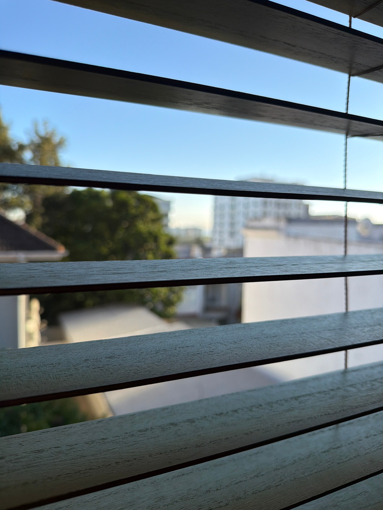 The image shows a view through partially open vertical blinds. The background is blurred, but appears to be an urban scene. Through the gaps in the blinds, there is a glimpse of a blue sky, foliage (p…read more