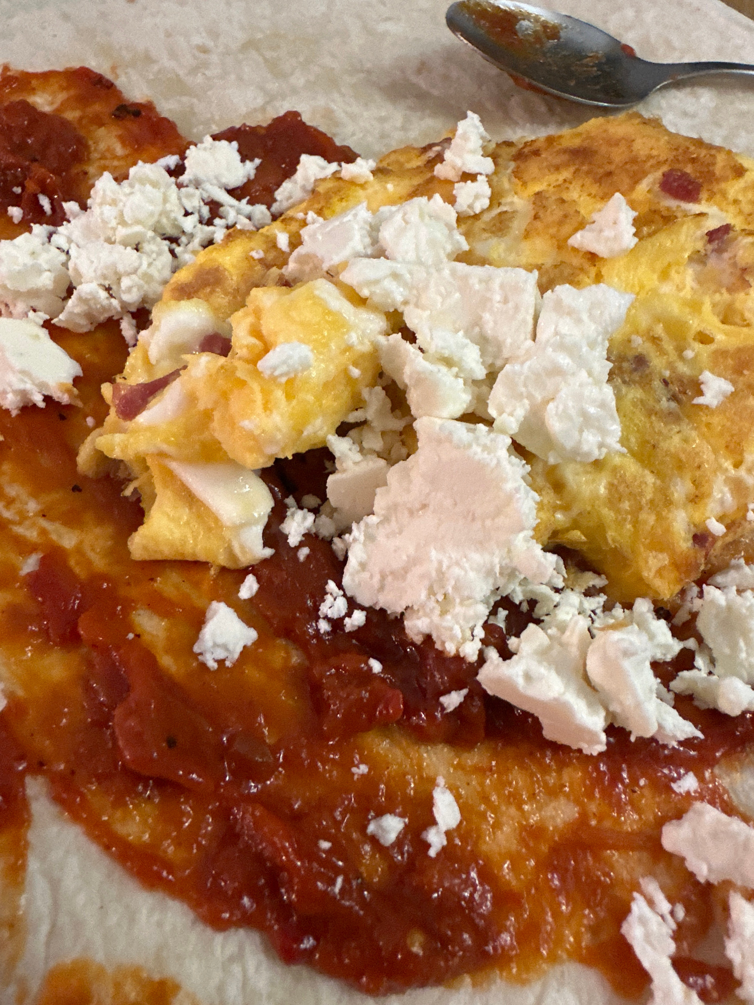 This image depicts a close-up of a plate of food, likely huevos rancheros. An omelet, with flecks of what appears to be ham, is topped with crumbled white cheese. The omelet is situated next to a pool…read more