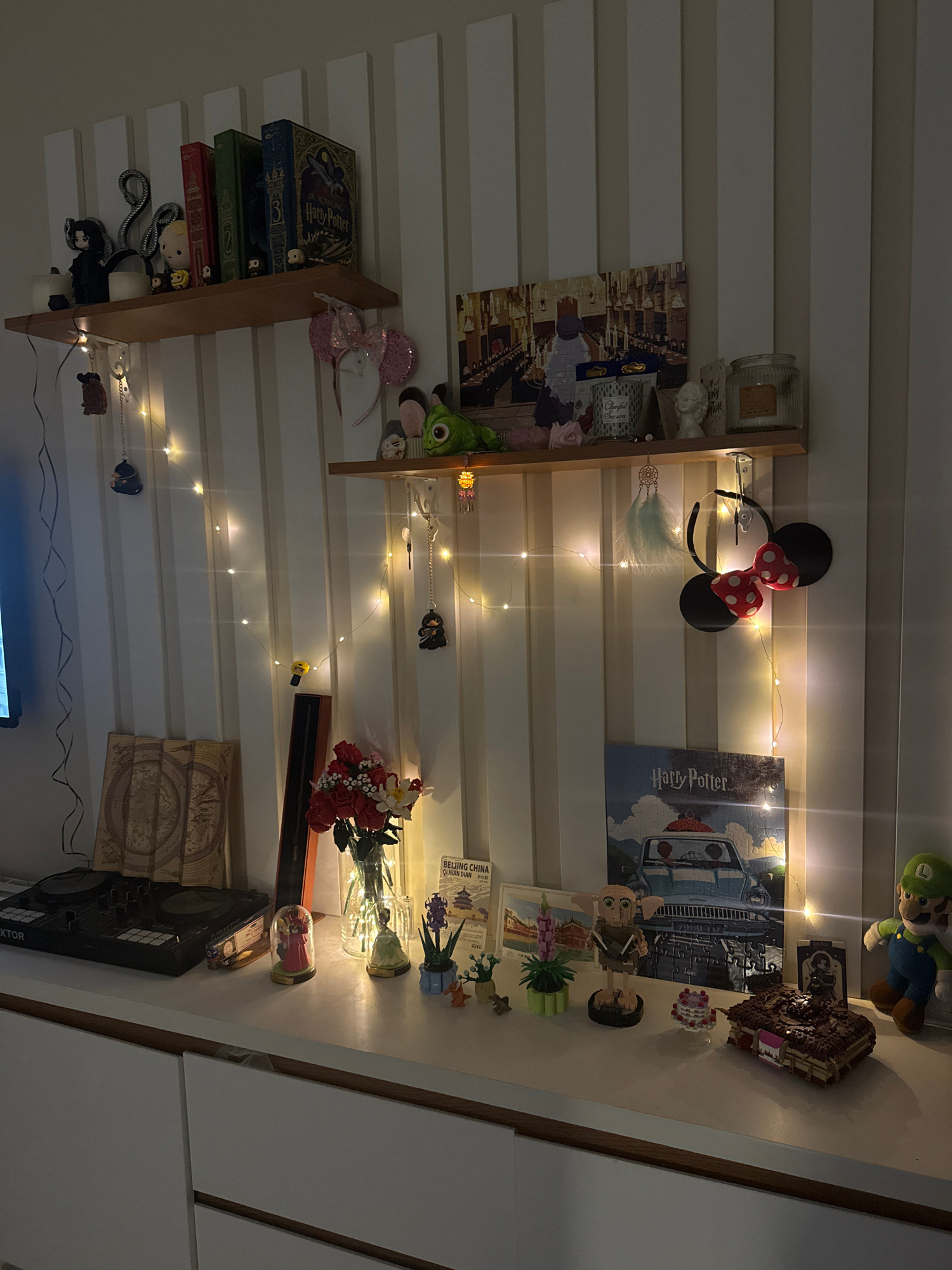 The image shows a wall with white horizontal panels and two wooden shelves. The shelves are decorated with various items, including books (some Harry Potter themed), decorative objects (like flowers,…read more