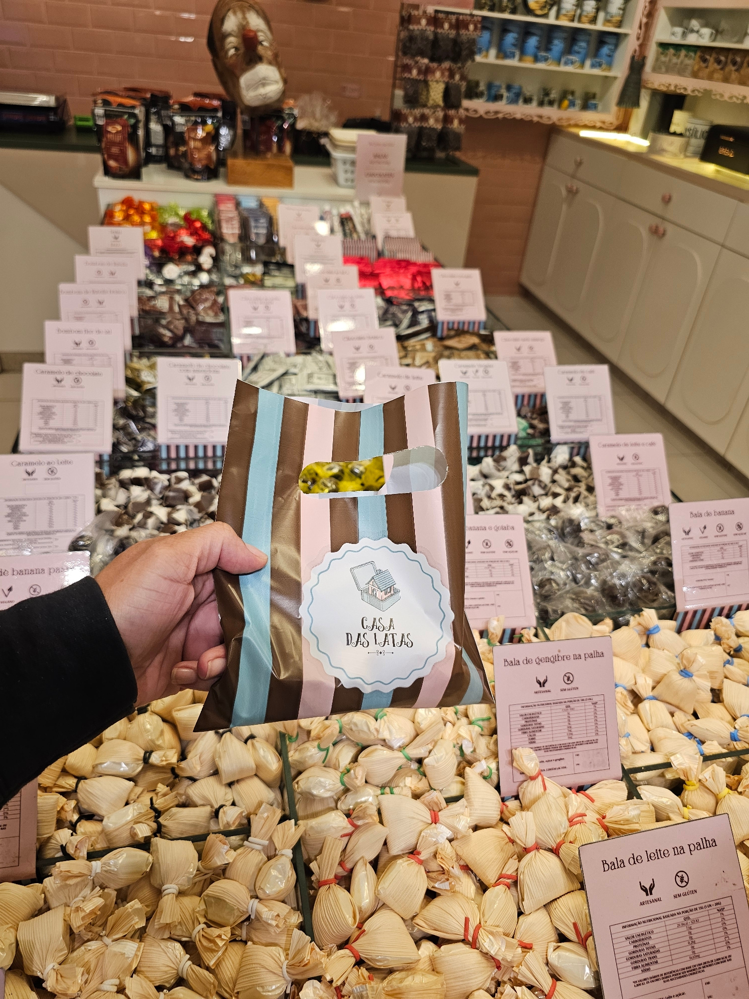 A hand holds a striped bag labeled "Casa Das Latas" in a candy store displaying various sweets. The shop sells items such as caramelos de chocolate, caramelos ao leite, balas de banana, balas de gengi…read more