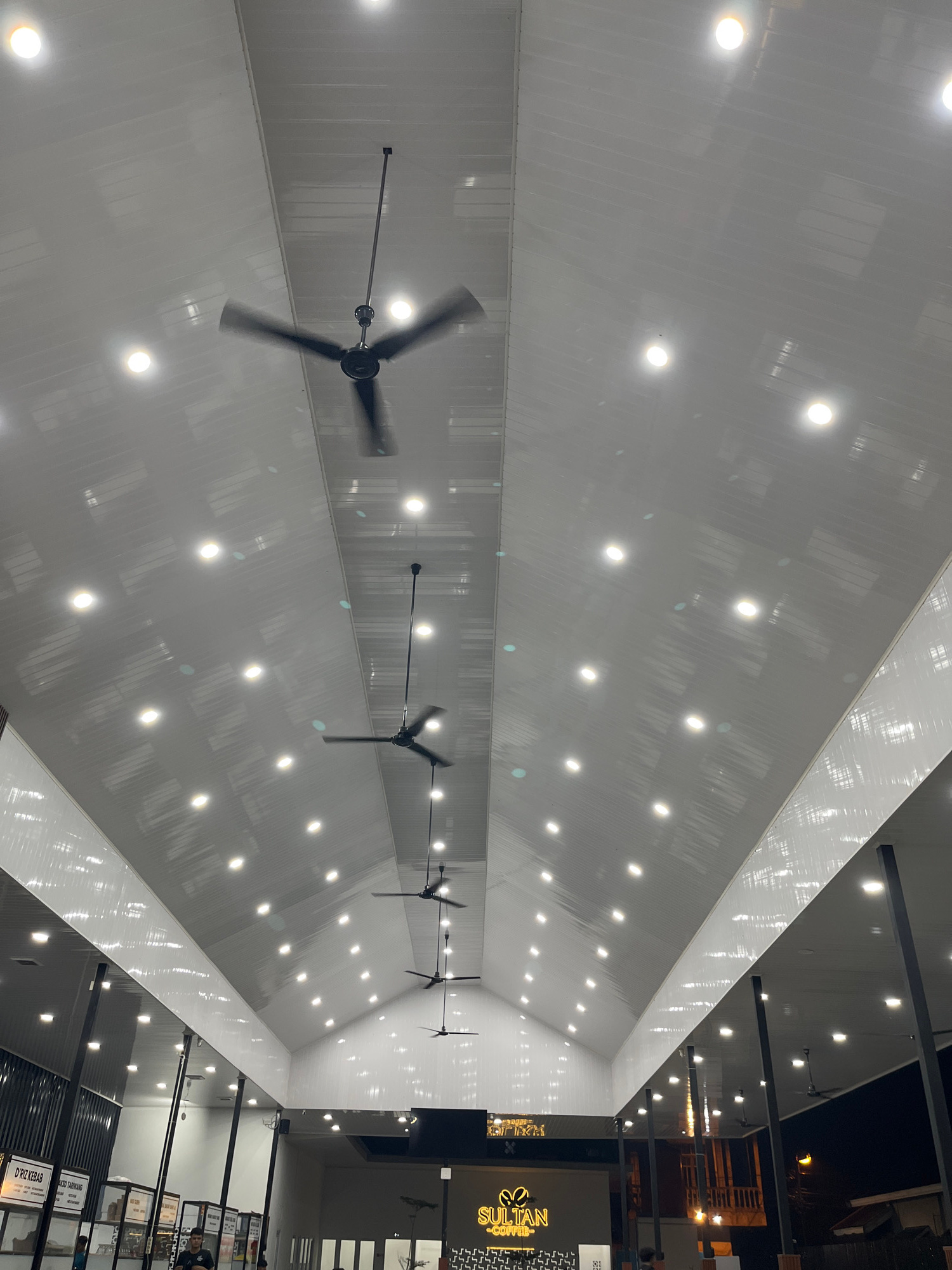 This image captures a wide, modern indoor space, likely a commercial establishment such as a food court or market hall, seen from a low angle looking up towards the high ceiling. The dominant features…read more