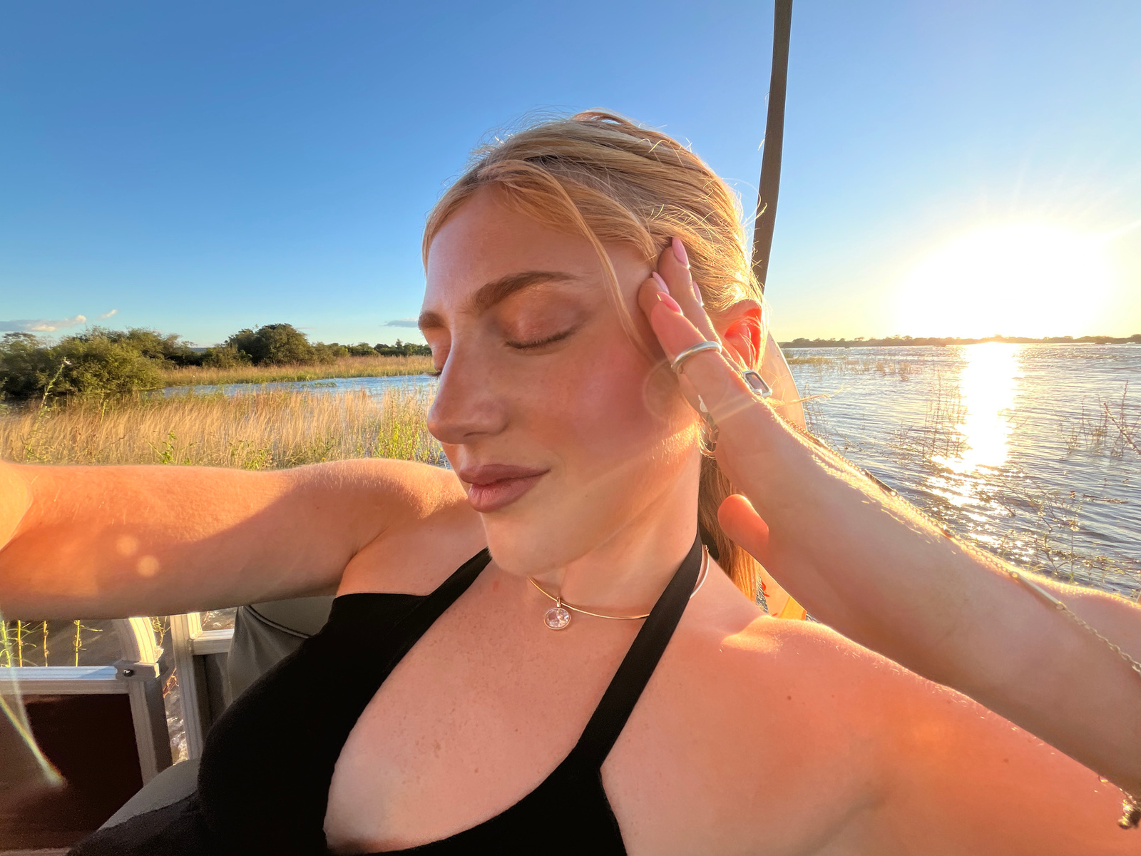 A woman stands in Livingstone, Zambia, captured in a close-up, upside-down, eye-level shot. She's seen from the chest up, eyes closed, with her right hand touching her face. She wears a black top and…read more