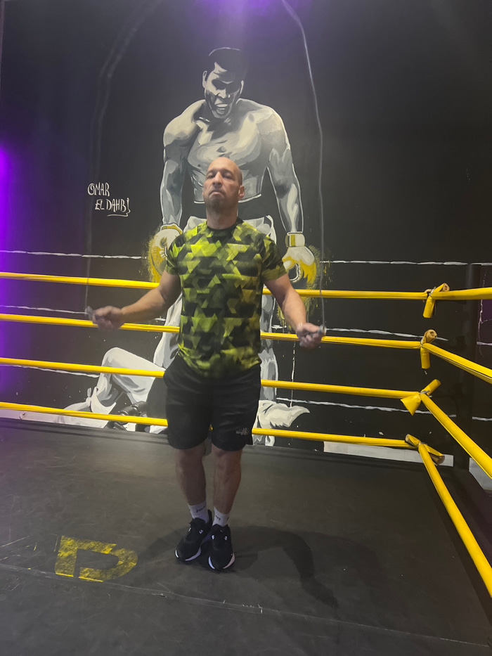A man in a patterned shirt and black shorts stands in a boxing ring installation, his arms outstretched, gripping the yellow ropes. Behind him is a mural depicting a boxer. The scene is lit with a pur…read more