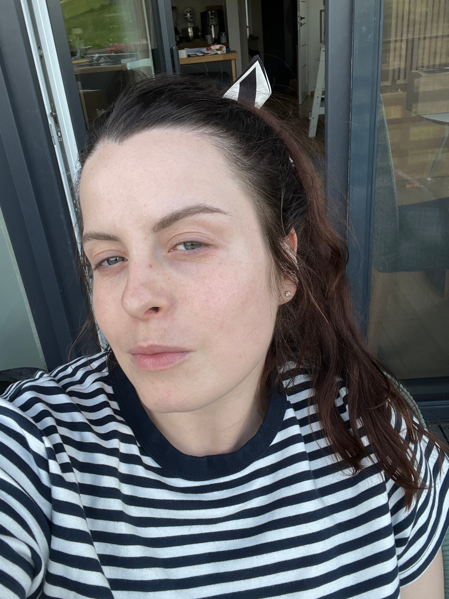 A medium close-up portrait shows a woman with long, dark brown hair, light eyes, and fair skin, appearing to recline or lie down indoors, looking towards the camera with a neutral expression. She wear…read more