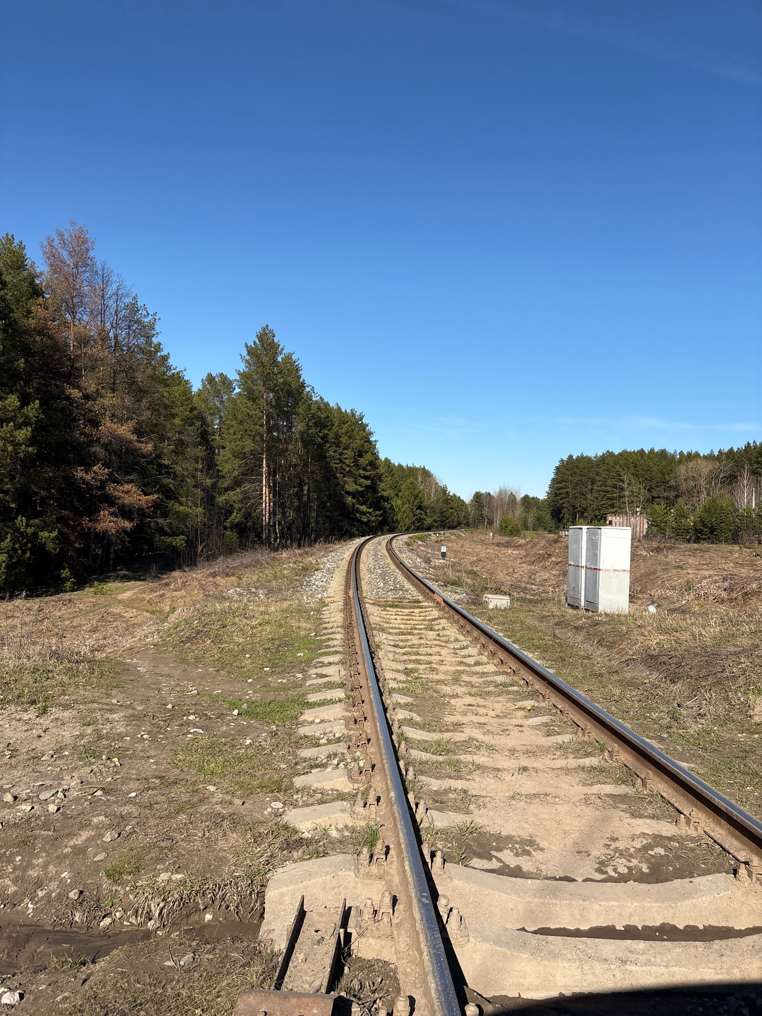 The image, correctly oriented, displays a single railway track curving gently to the right, extending into the distance through a rural landscape. The track consists of metal rails laid on concrete sl…read more