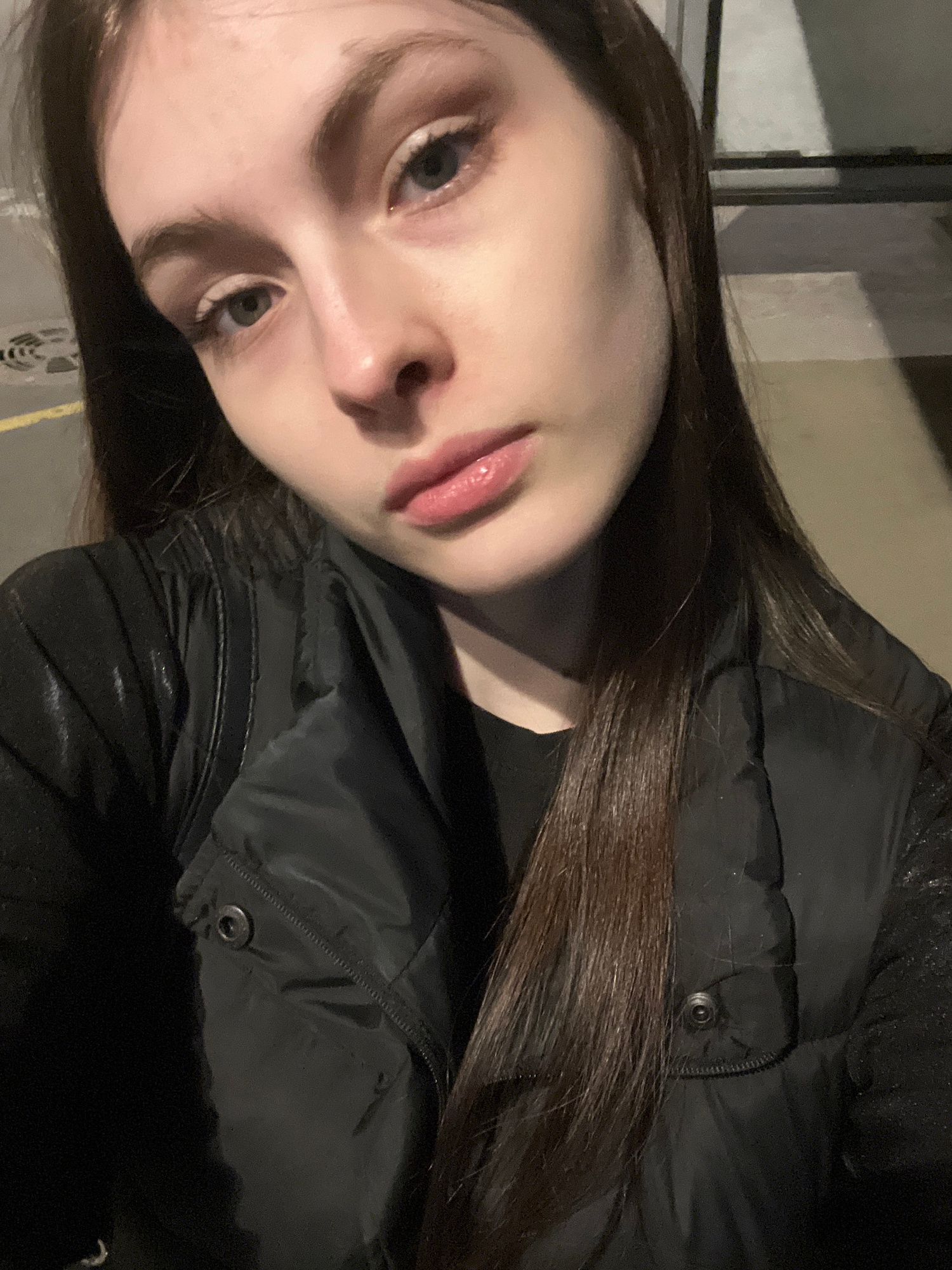A young woman is positioned in the lower left quadrant of the image. She appears to be wearing a black puffer jacket. The background features a wall-like structure, possibly part of a building. The lo…read more