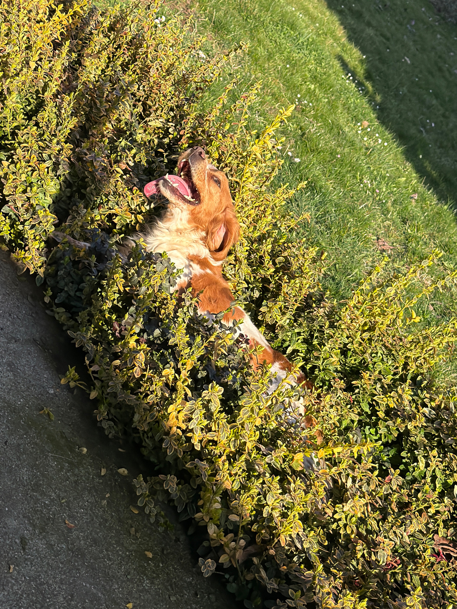 A medium-sized, brown and white dog lies mostly concealed within a low-lying bush or ground cover in an outdoor setting. The dog has its mouth open, tongue exposed, appearing to pant or smile. The pla…read more
