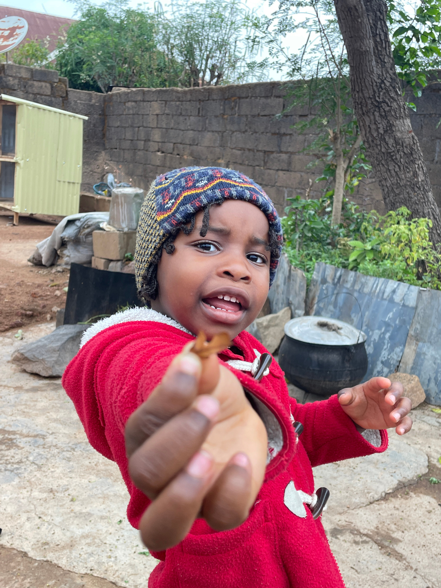 The image depicts a young child wearing a blue and multicolored knit hat and a red hooded coat standing in an outdoor setting. The child is holding out a small brown object, possibly food, towards the…read more