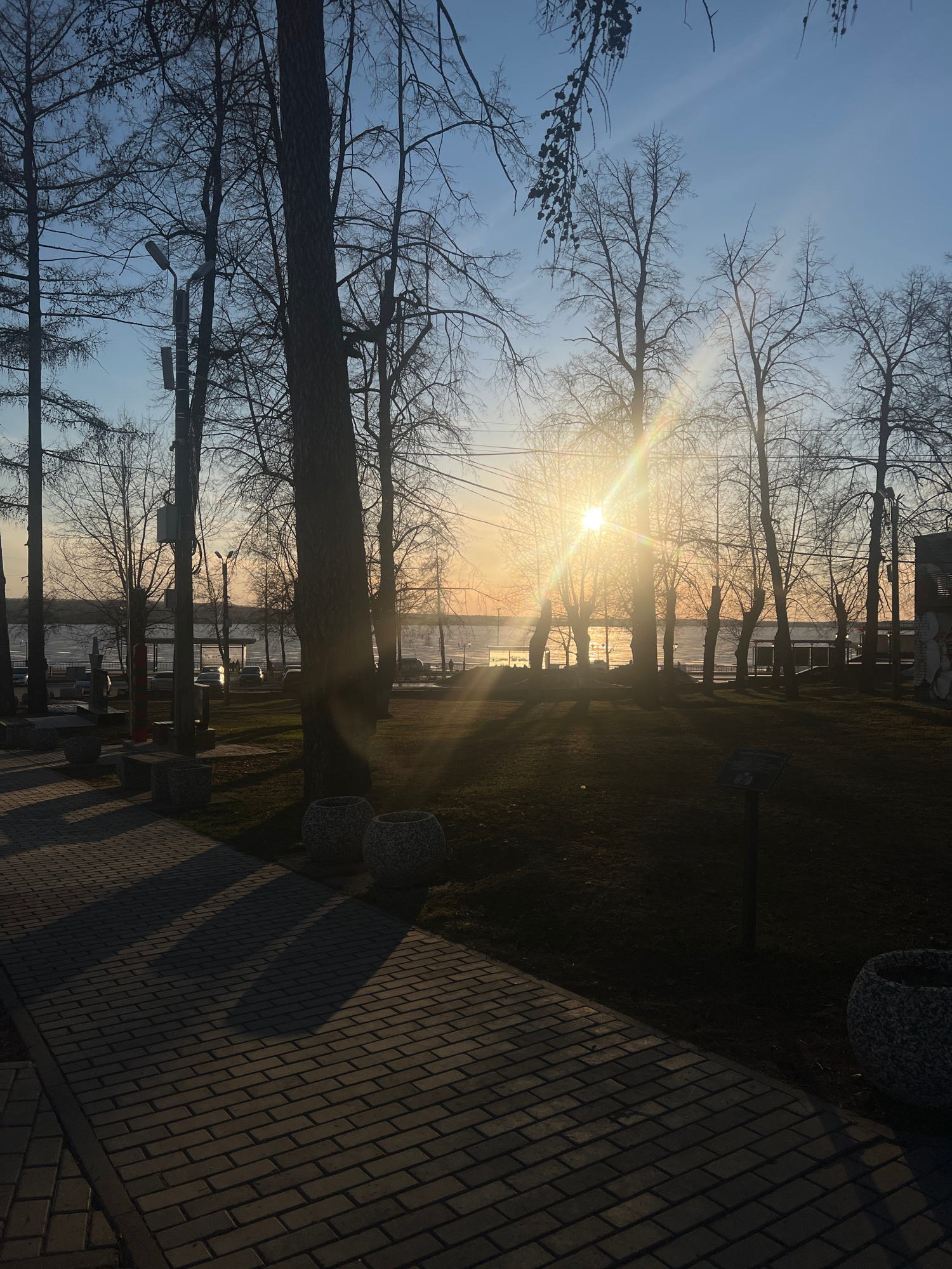 The photograph depicts a park in Votkinsk, Russia, at sunset. Trees line the edge of a body of water, with their bare branches reaching towards the sky. The setting sun is positioned behind the trees, creating a bright glare and casting long shadows across the ground. A paved brick walkway is visible along the right side of the frame, with grass and a few decorative stone containers to the left of the path. The sky is a gradient of blue and orange hues due to the sunset. There are lampposts visible among the trees, along with some structures on the water's edge in the distance. No people are immediately visible in the image. | Open Wire