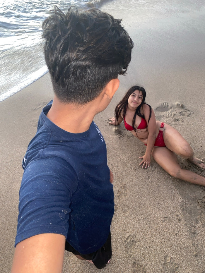 A man takes a selfie at the beach. He's wearing a navy blue long-sleeve shirt. Waves are visible in the background. A woman in a red bikini poses on the sand, looking up at the camera. Footprints dot…read more
