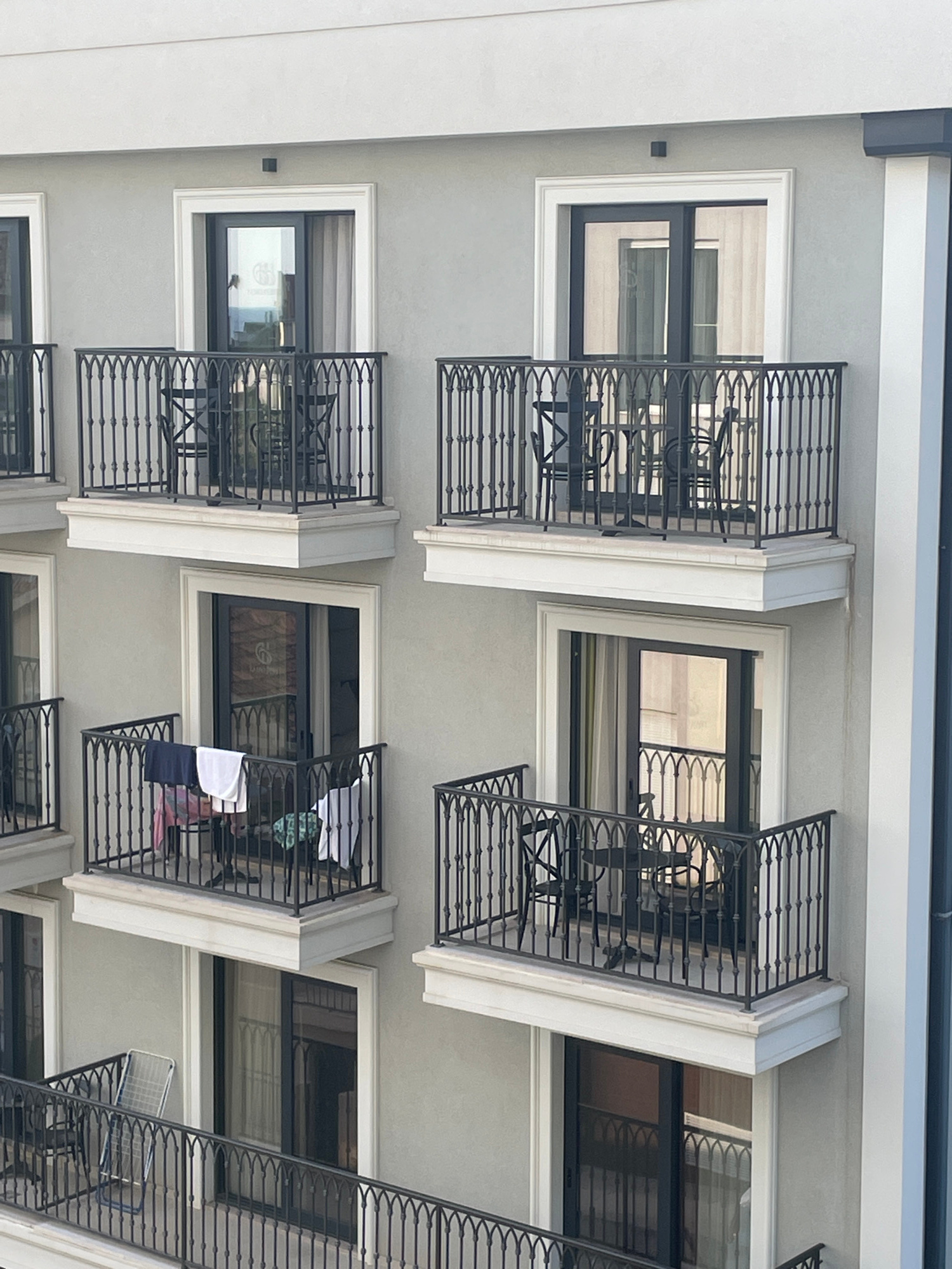 The image shows the facade of an apartment building. The building is several stories tall, and each apartment has a balcony with black iron railings. Some of the balconies are empty, while others have…read more