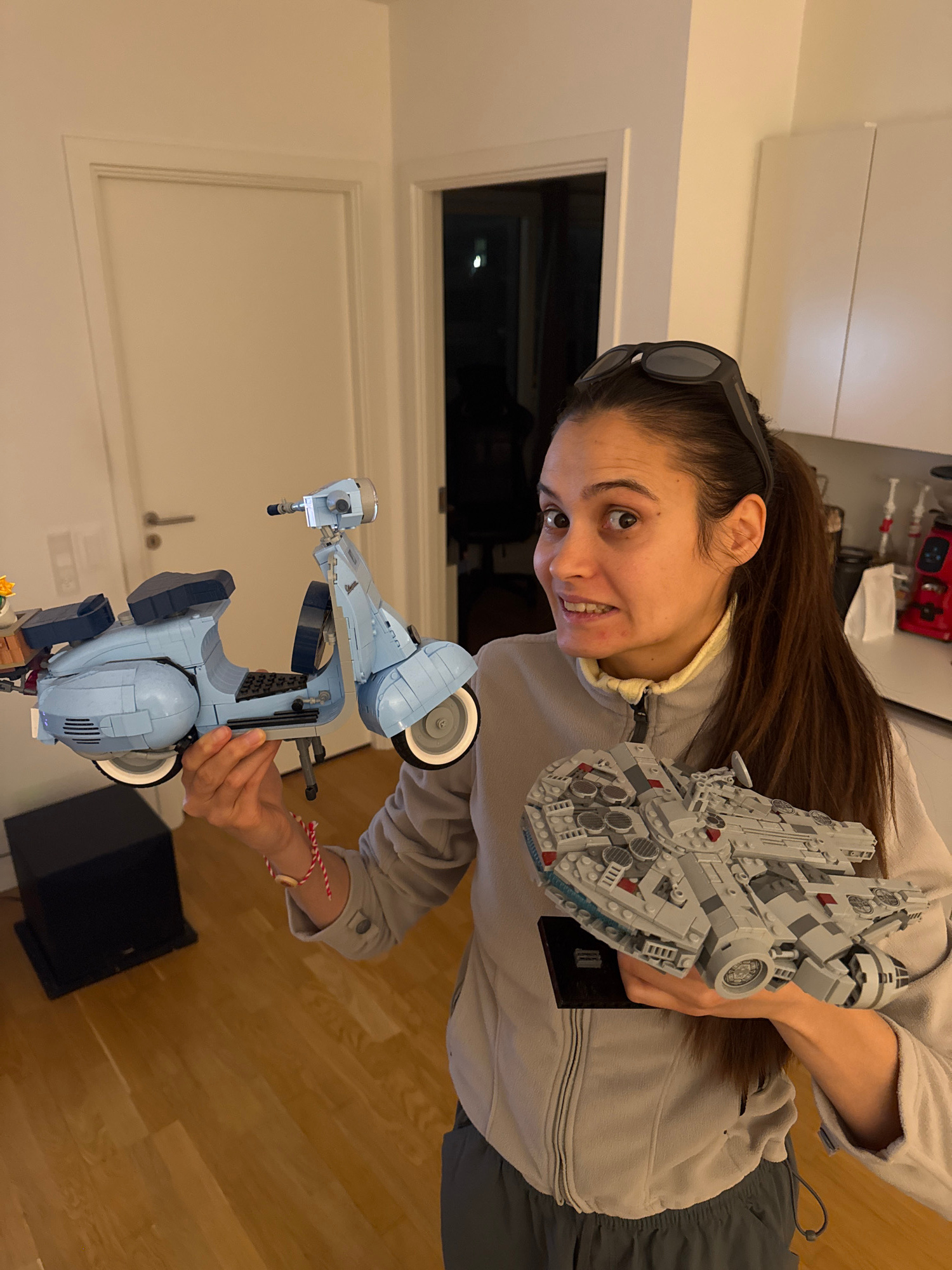 A person with long brown hair, wearing sunglasses on their head and a gray fleece jacket, is holding a Lego Millennium Falcon in one hand and a Lego Vespa in the other. They are indoors, in a room wit…read more