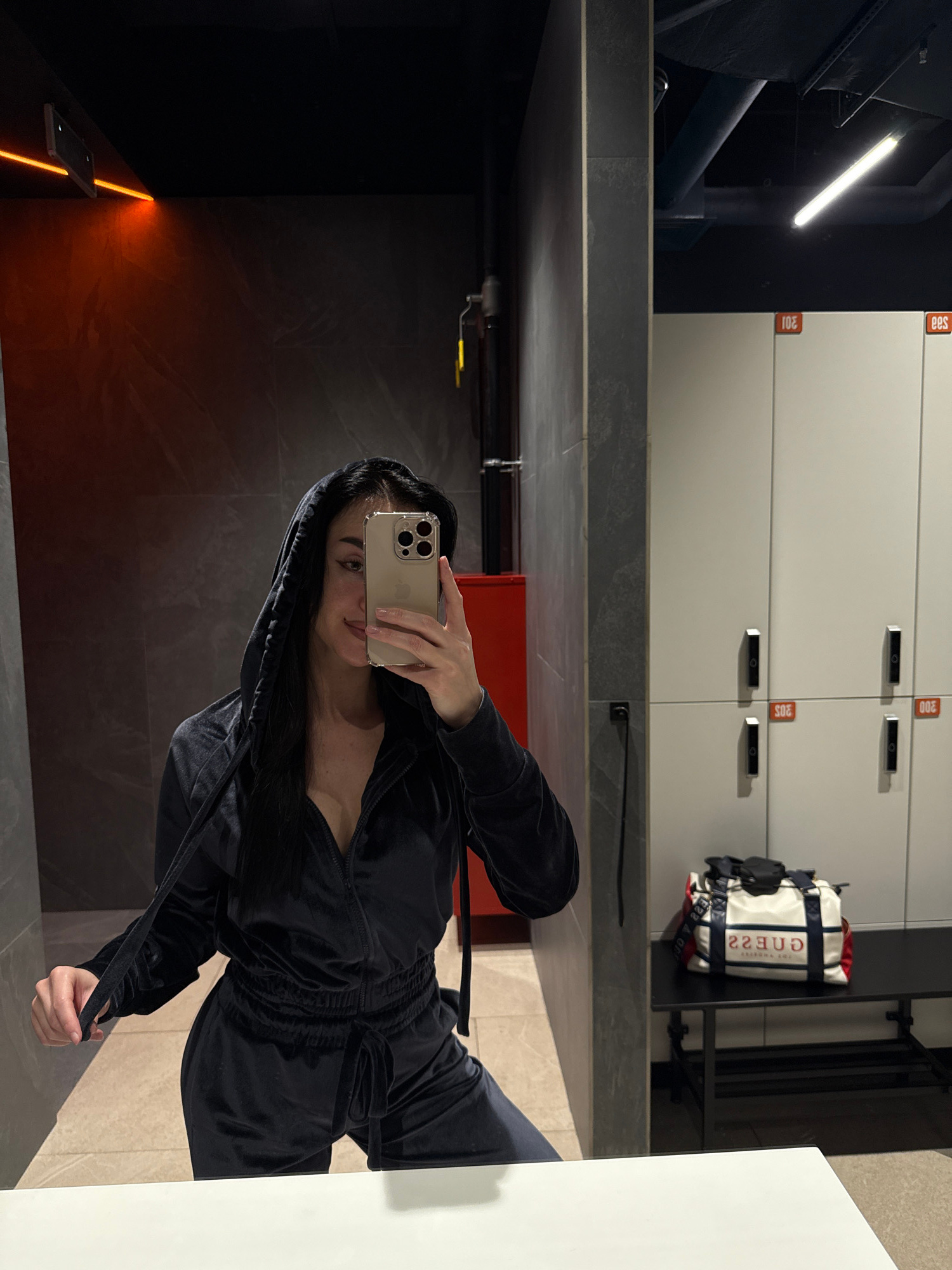 The image shows a woman in a dark velvet sweatsuit taking a selfie in what appears to be a locker room or bathroom. The background includes lockers with numbers visible, a Guess brand duffel bag, andβ¦read more
