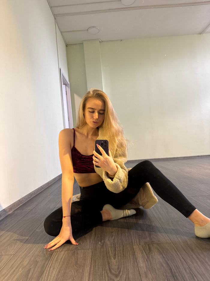 The image displays a young adult female sitting on a dark wood-laminate floor, taking a mirror selfie. She has long blonde hair and is wearing a dark red velvet crop top with thin straps, black leggin…read more