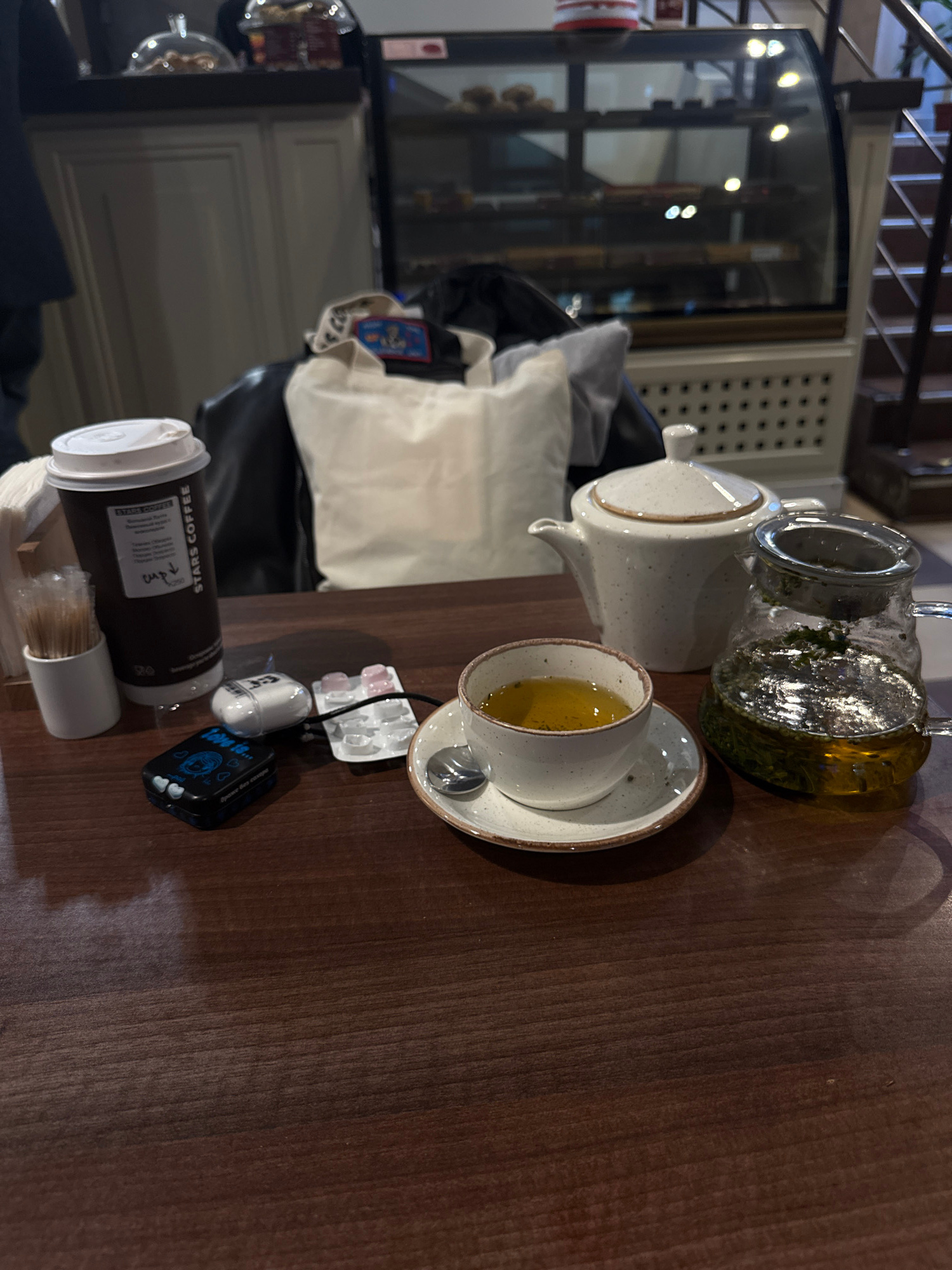 The image depicts a table in what appears to be a cafe. On the table are tea service consisting of a ceramic teapot, a glass teapot, a tea cup with a saucer, a Stars Coffee branded disposable cup with…read more